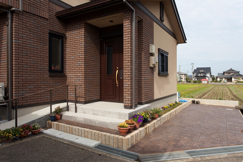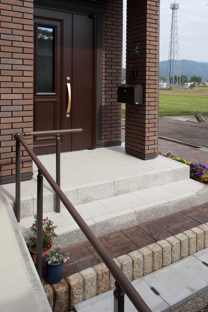 2014/05/29福井県 福井 M様邸 スタンプコンクリート グリップライン手摺 スロープ 南条砂利 今日は玄関周りをデザインしたM様邸の施工写真を紹介します。 M様邸は玄関横のスペースにスタンプコンクリートを施工し、 同じデザインのスタンプコンクリートで階段を1段追加しました。 ピンコロの花壇と続いたデザインで、建物ともマッチしています。 その横にはスロープも設置。 転倒防止も兼ねた手摺(グリップライン)で安全に上り下りできます。 建物周りは南条砂利を敷いて、ドロハネ防止・防犯の効果があります。