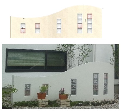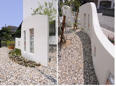 建物と同じように、白い塗り壁にし、上面をR型にすることで