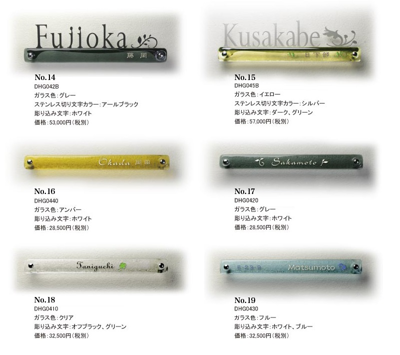 ガラス表札G-04は、ガラス色、文字種類、オーナメント、ガラス部への彫り込み等を