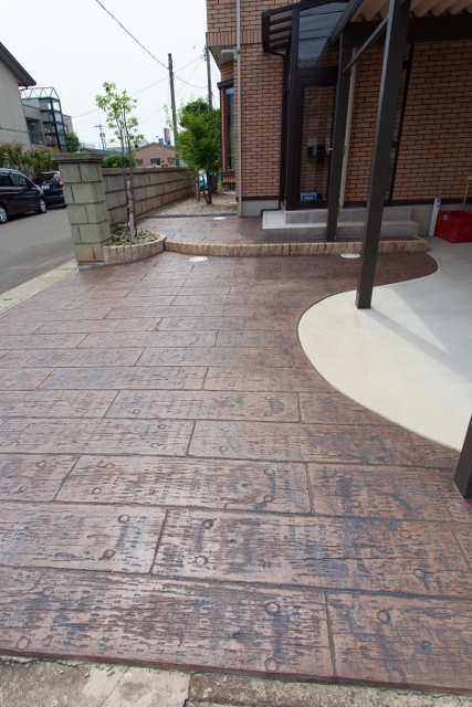 外壁に合わせて、アプローチには枕木模様のマットスタンプ