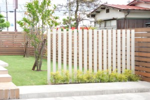 外からの 目隠し には 三富ビーウッドフェンス を 外壁と合わせた色を施工。