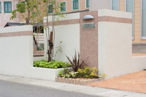 正面の モニュメント の色も、外壁に合わせてた  白の塗り壁に オレンジピンク系の