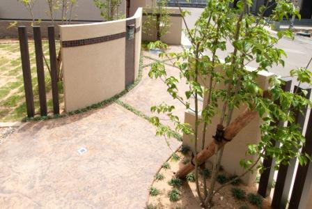 素敵なモニュメントにデザインコンクリート(スタンプコンクリート)、タイルテラスに