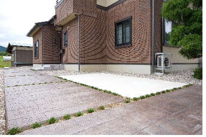 N様邸は、スタンプコンクリート・目地はタマリュウ、カーポート、既存家屋との