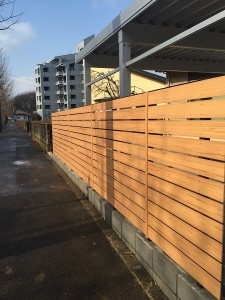 道路境界にブロックを積み その上にBウッドフェンスを施工しました。