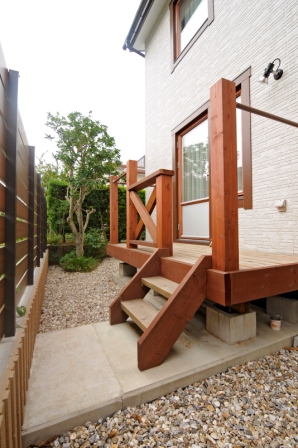 ウッドデッキ、目隠しフェンスそれぞれの色が建物の外壁とよくマッチしています。