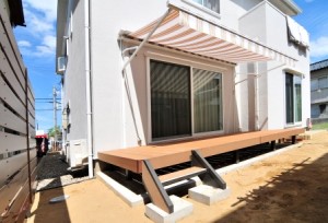 2013/05/27福井 福井市 外構工事 樹脂デッキ オーニング リバーフォレスト テルです★ 今日は先週ご紹介したT様邸の 後ろ側をご紹介します。 お家の後ろには樹脂デッキ(樹の木)を取り付け、 縁側のようなスペースを作りました。 また、オーニングも付けて日よけ対策もバッチリです!! もちろん、Bウッドフェンスで目隠し対策もしてあります。 今の季節はデッキの上でのんびりすると気持ちよさそうですよね!!