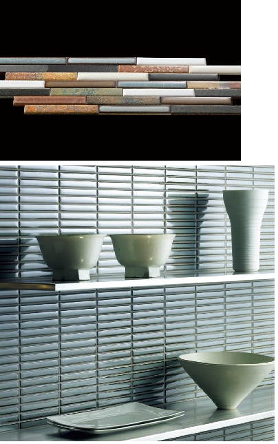 インテリアモザイク 窯変ボーダー : 和を感じさせる窯変釉と繊細さを感じさせる小さなサイズが特徴。モダンな空間を演出します。
