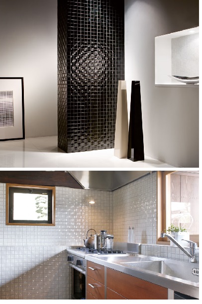 インテリアモザイク 釉泉 : 釉薬と凸凹レリーフによる焼き物の味わいが照明に映える美しい壁面をつくります。