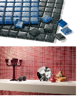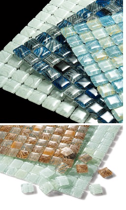 さまざまな柄と色合いが混ざり合った表情で、深み感や透明感のあるガラスモザイクです。