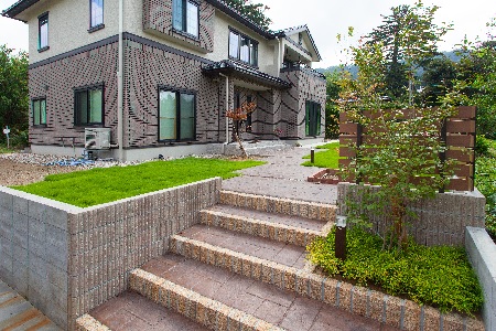 階段の部分は、化粧ブロックを積み、ピンコロ石で蹴上+花壇をつくり、