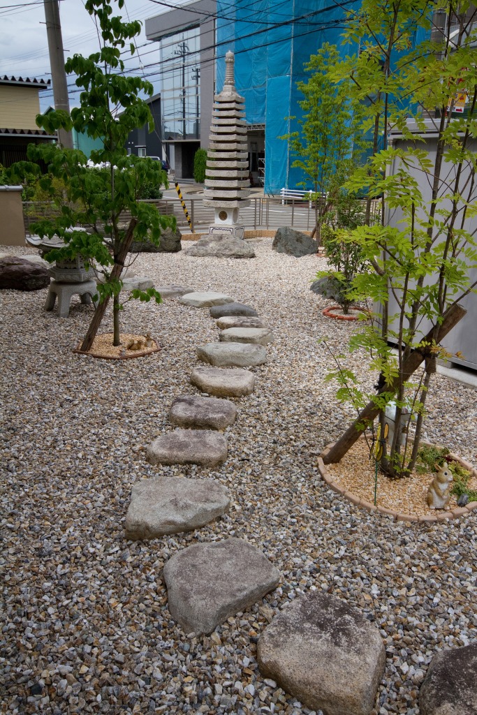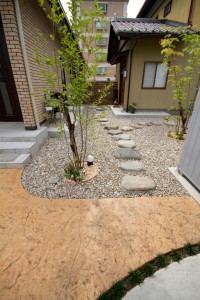 南条砂利 南条珪石 )を敷き詰めた中、樹木 の間を 自然石飛石 を配置しました。