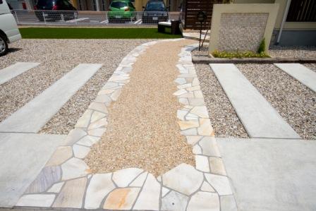アプローチには乱景石貼りと洗い出しでコントラストで玄関までお客様をお迎えします 。