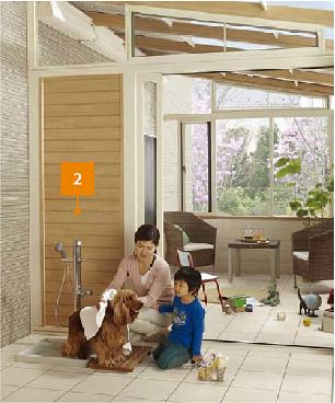 追加屋根の下にペット用水栓柱とパンを併設すれば雨の日でもちょっとした洗い物ができますね。