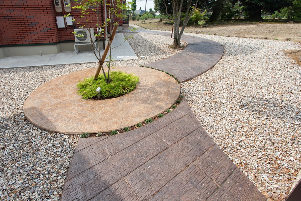 アプローチは枕木マットスタンプを中心に、途中のシームレスマットスタンプのサークルにシンボルツリーを配置しました。
