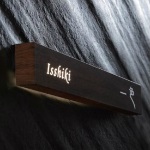 木漏れ日のような優しい光で文字が浮かび上がったように見える木目調のサイン。