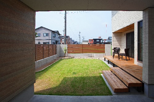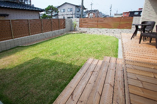 中のお庭部分には、レンガ花壇、芝貼り、ウッドデッキを施工させて頂きました☺