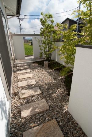 歩くところは、平板を敷き、南条砂利を入れ、塀にそわせて、樹木を植えて、夜も真っ暗にならないように、ルーメンキューブを入れました。