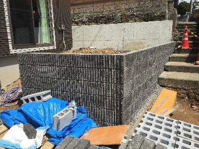 深基礎の為、高低差があるので化粧ブロック(ユニソン:ジャスティ)でぐるっとまわりを囲み、