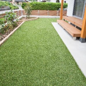 新築外構 木彫 フェンス おしゃれな 人工芝 アプローチ