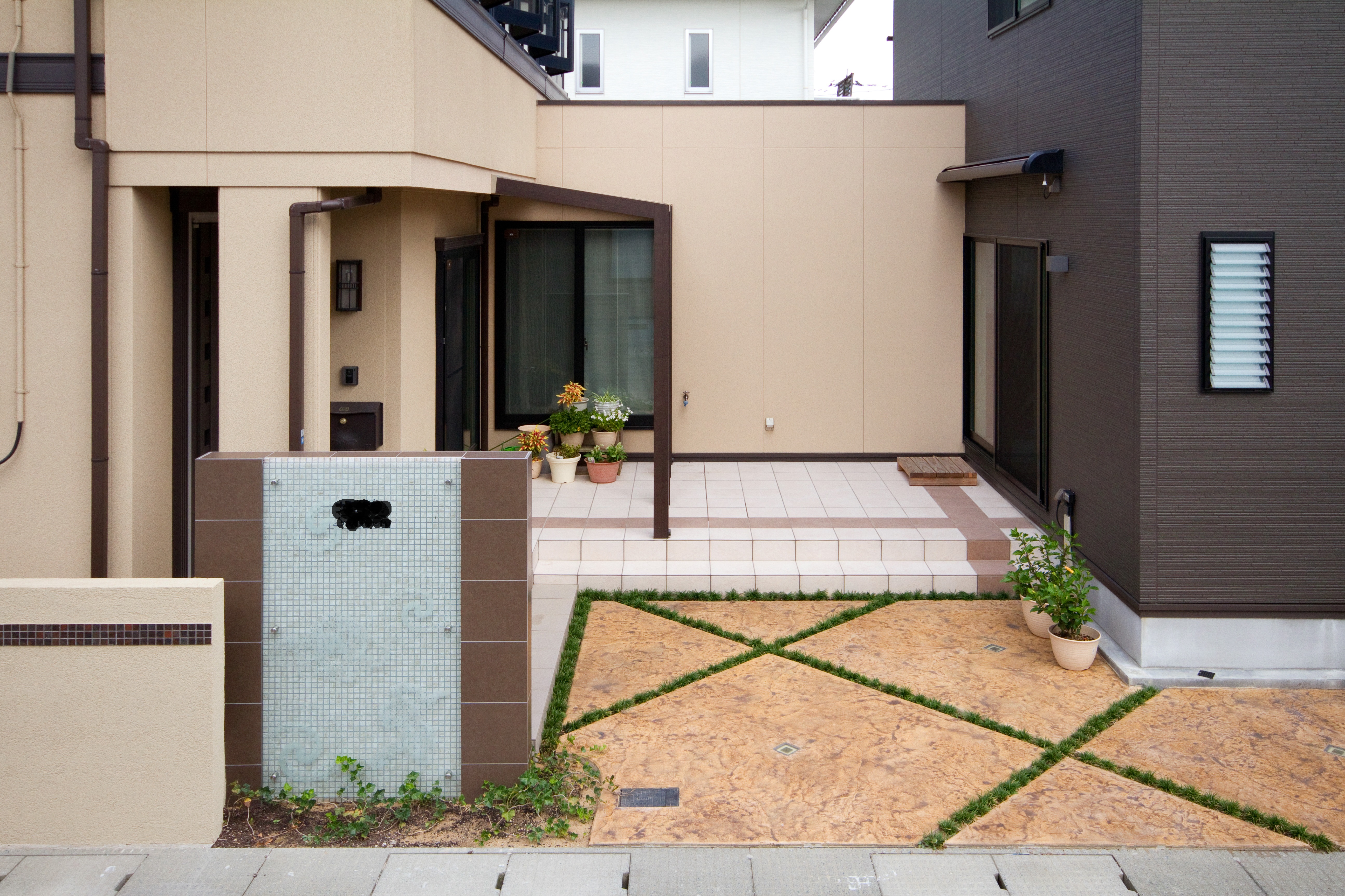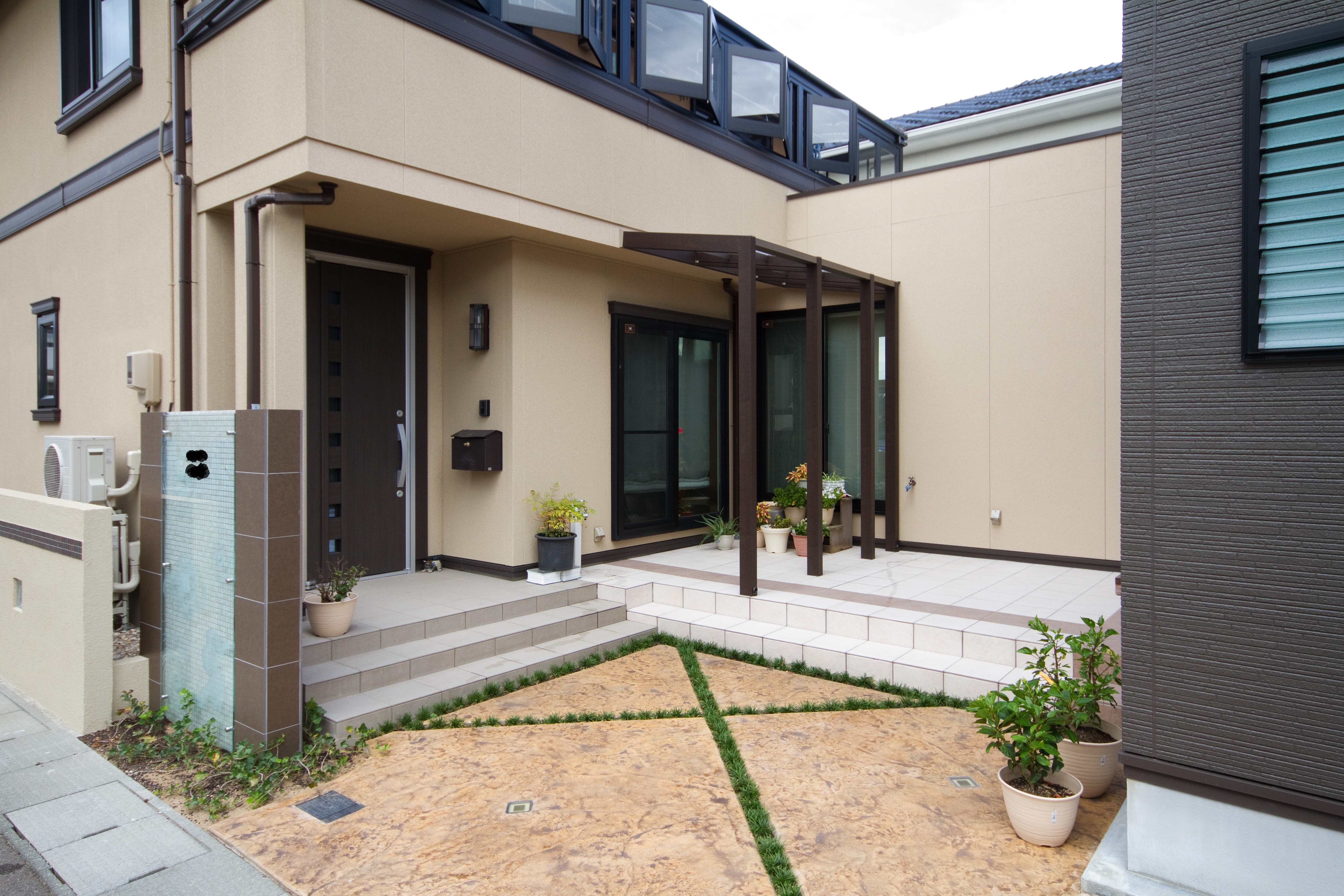 合わせて駐車場の床は斜めにスリットを配置したスタンプコンクリートで仕上げてスタイリッシュなイメージを演出しました。玄関横のタイル貼りテラスではおしゃれな屋根テラスが付き、いつでもうちカフェが楽しめるスペースとなりました♪