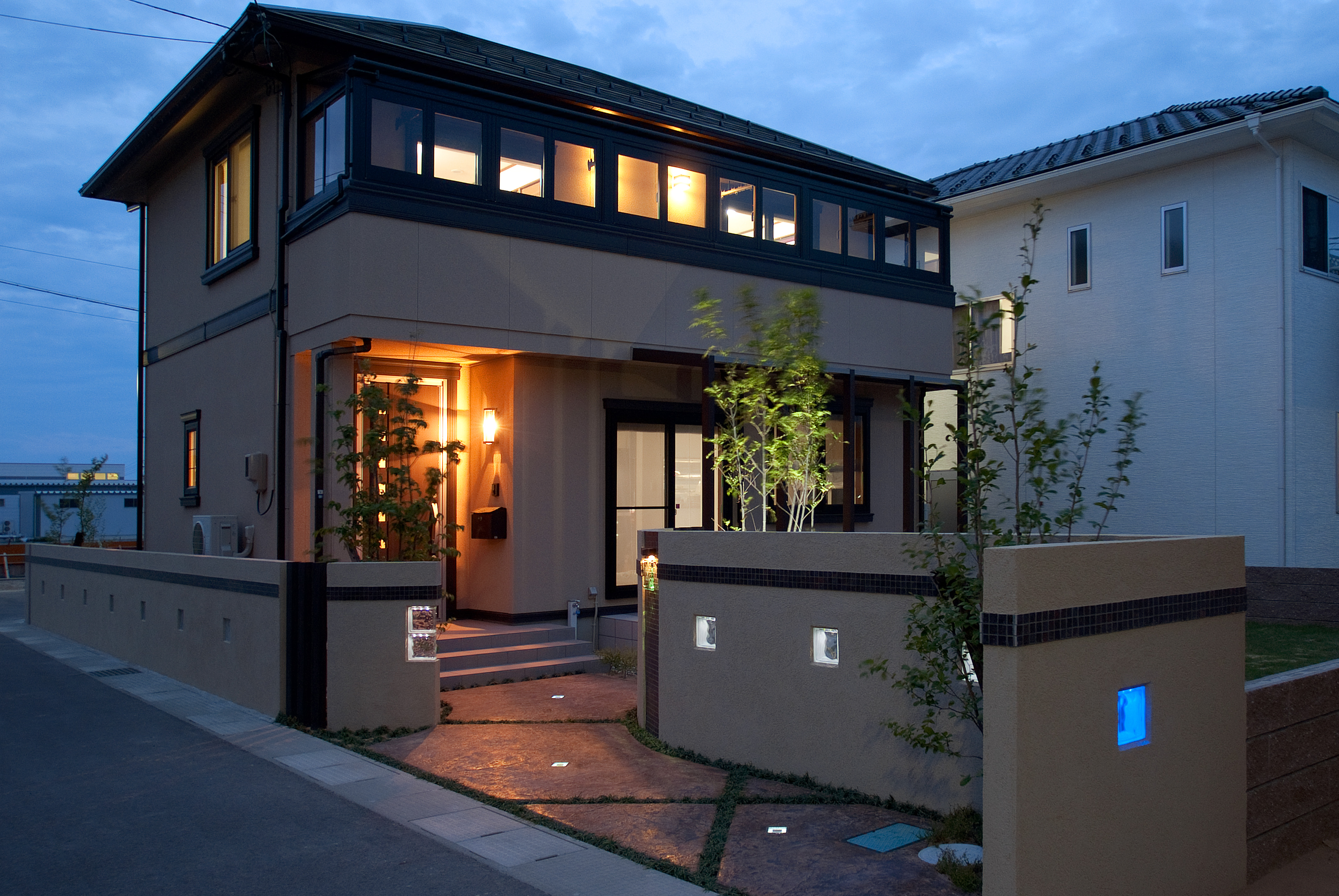 ガラス表札にLED表札灯で文字を浮き上がらせる演出をし、玄関前の塀にはLEDガラスブロックを配置し、