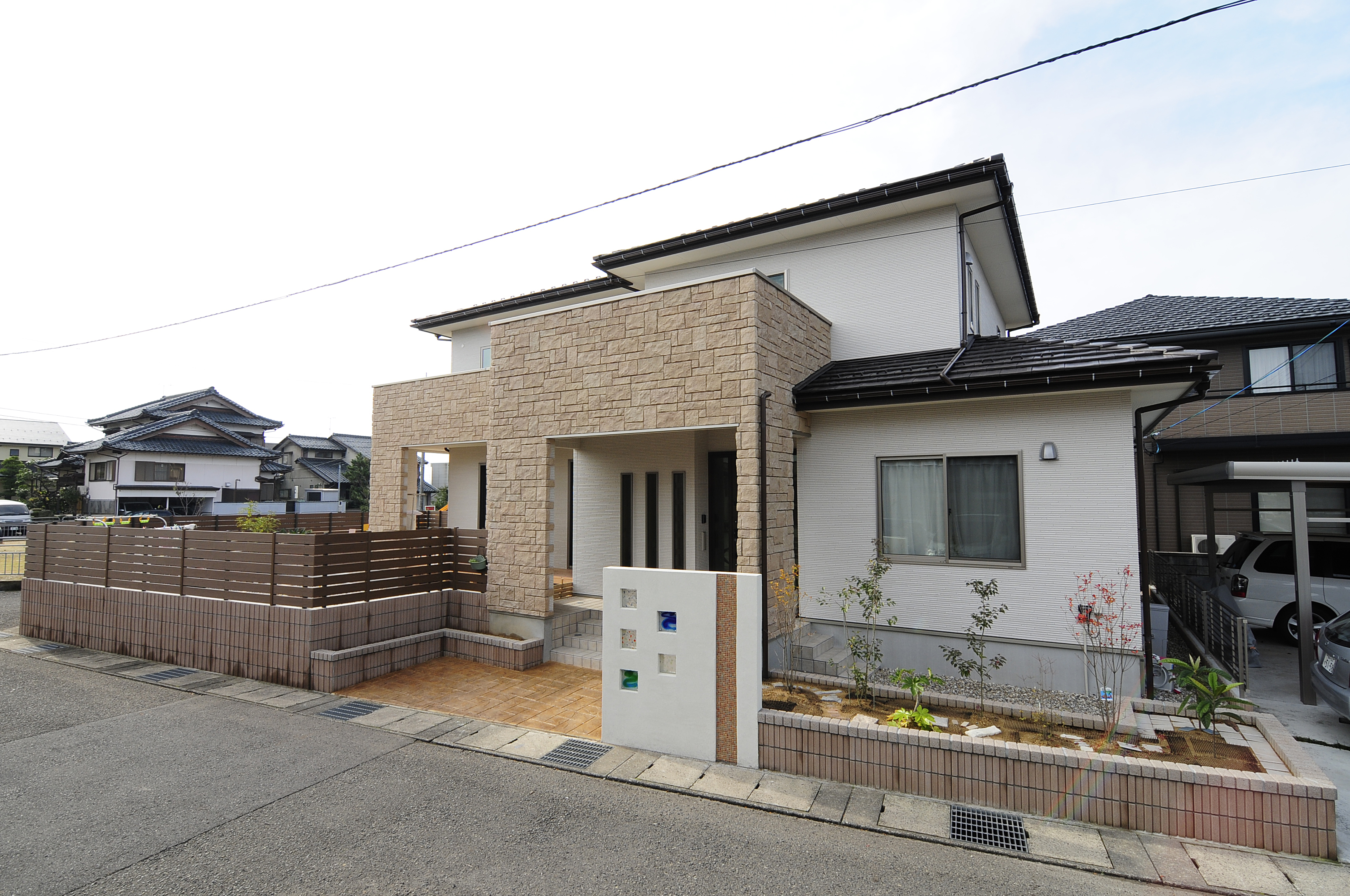 沖縄が大好きな施工主様でした。外構の顔モニュメントに美しい琉球ガラスを入れ、 家庭の温かさや、沖縄好きをさりげなくアピールできました。化粧ブロックで囲われた 花壇では、お客様が楽しめる様広くスペースをとりました。 さらにフェンスで目隠しされた横庭では、バーべQを楽しめるのも魅力的です。