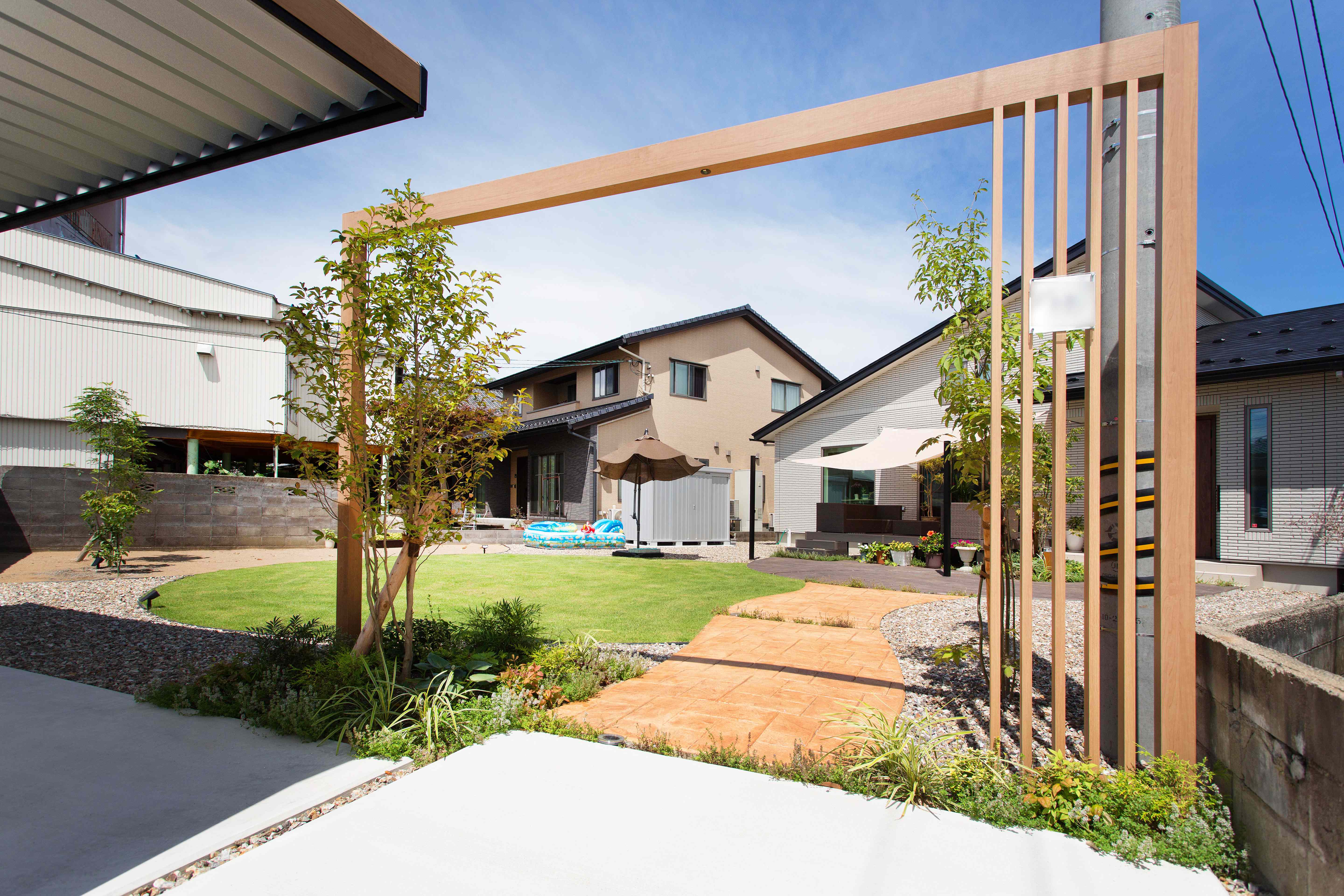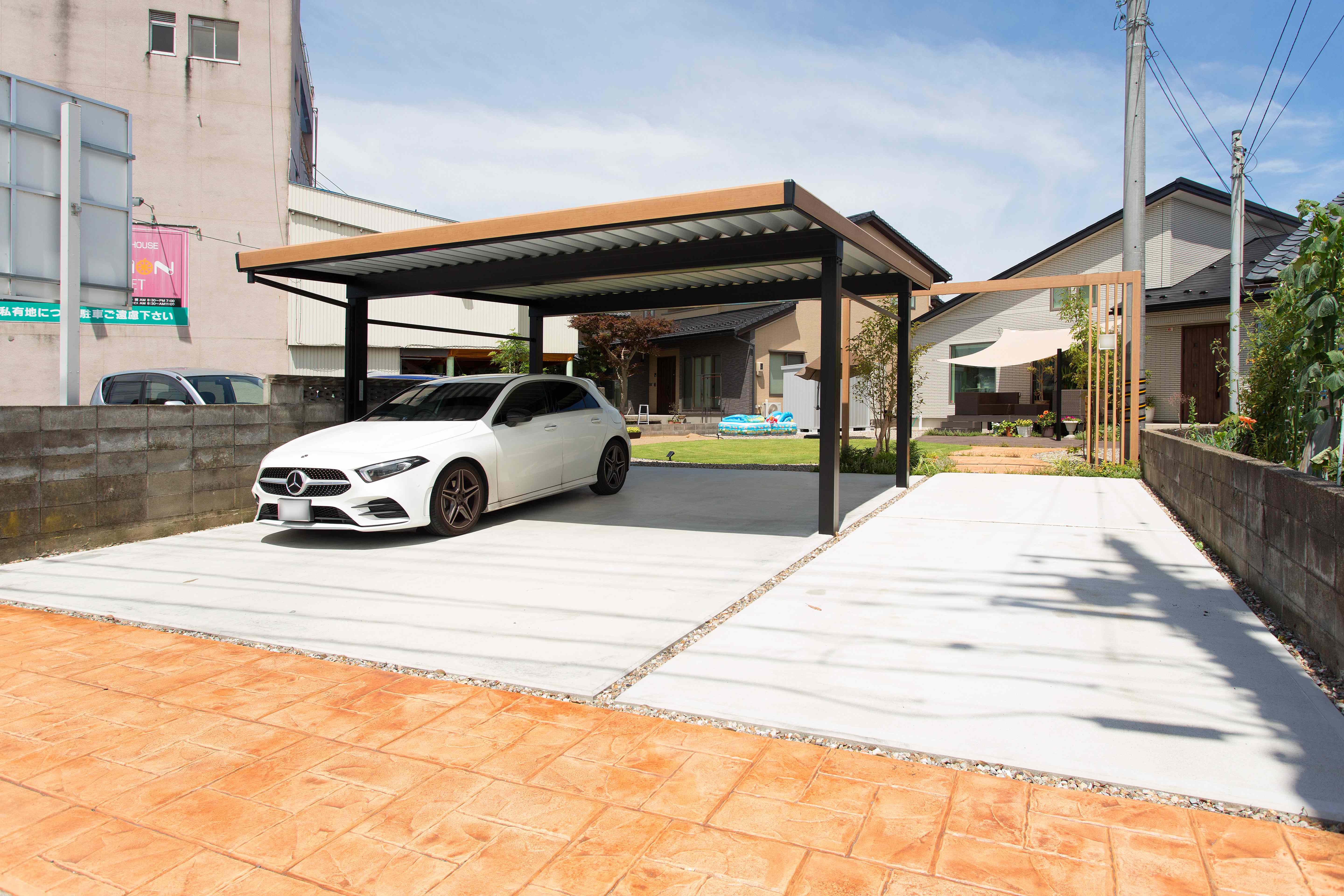 駐車スペースはシンプルな構造に。 木目調のアーチをくぐりぬけて住宅へと続くアプローチは、温かな色調で緩やかな線を描きました。 アプローチも兼ねたガーデンスペースは、木目調のスタンプコンクリートで遊べる空間に。 ウッドデッキの上にシェードを取り付けることで、より快適なリゾート空間になりました。