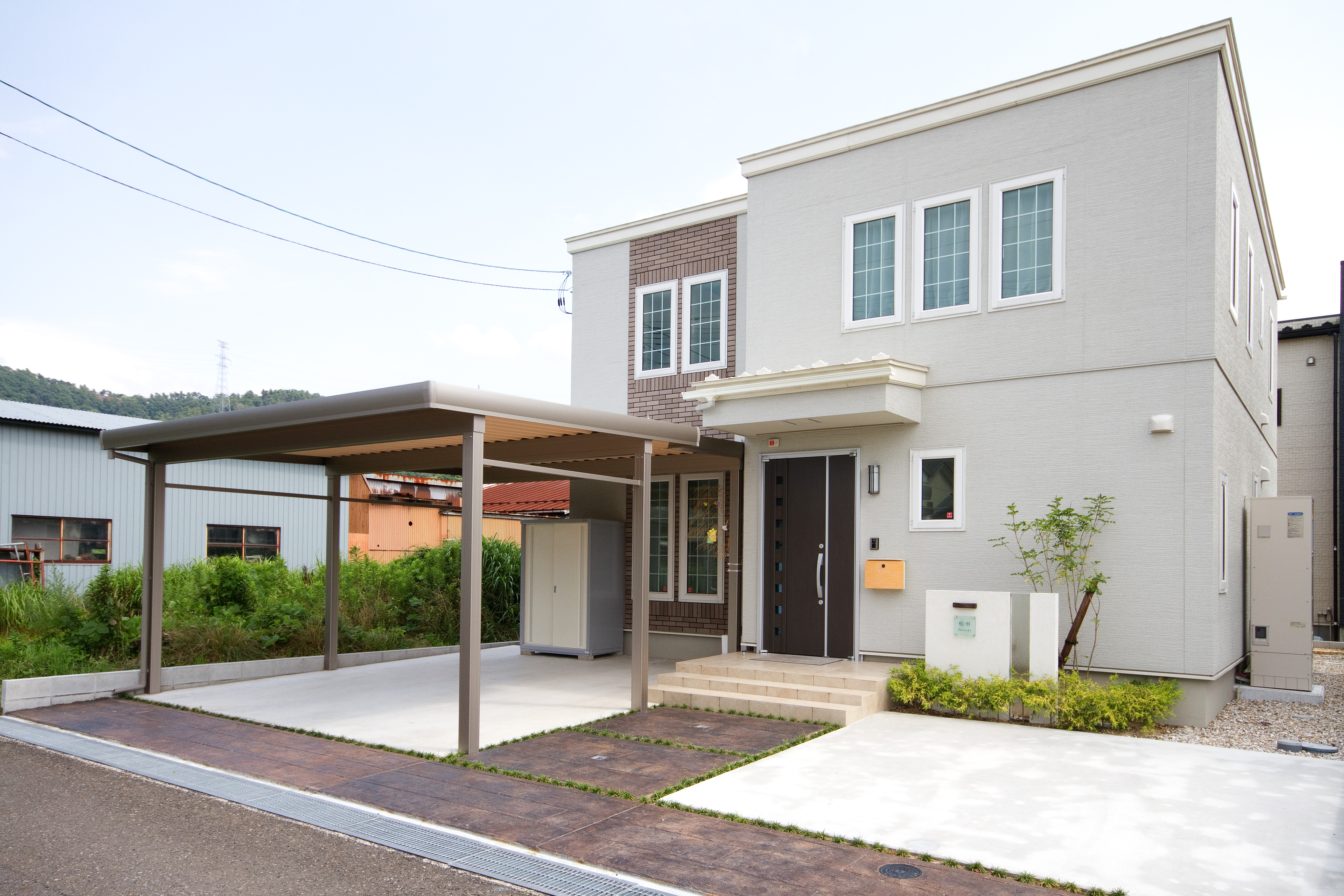 ガレージには積雪仕様のカーポートで2台用を採用。アプローチにはスタンプコンプリートで枕木調に仕上げることで足元も引き締まりました。お庭のテラスも洗濯物干し・目隠しに最適です。ポストがかわいらしくて斬新な建物ですがワンポイントになって素敵になりました♪