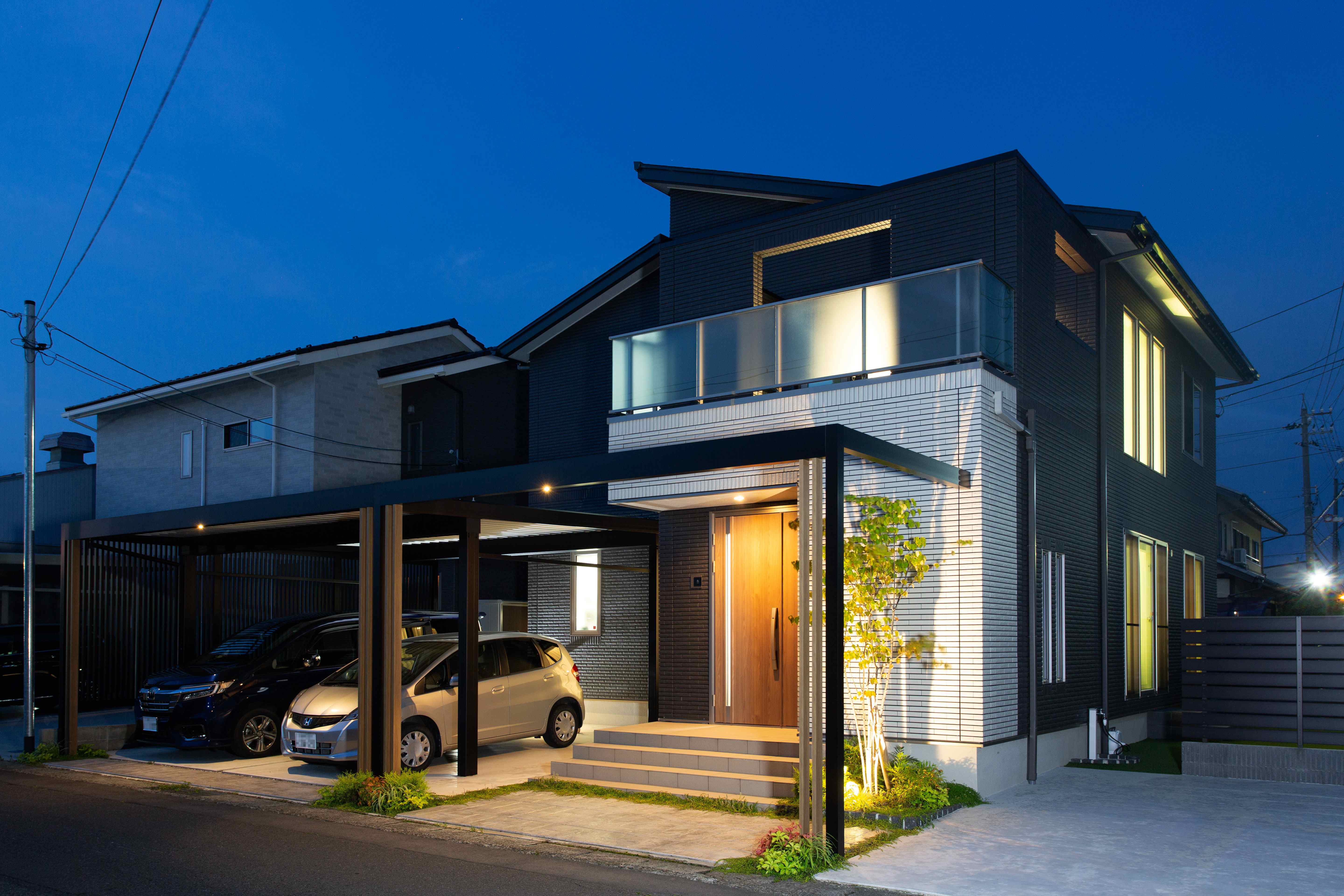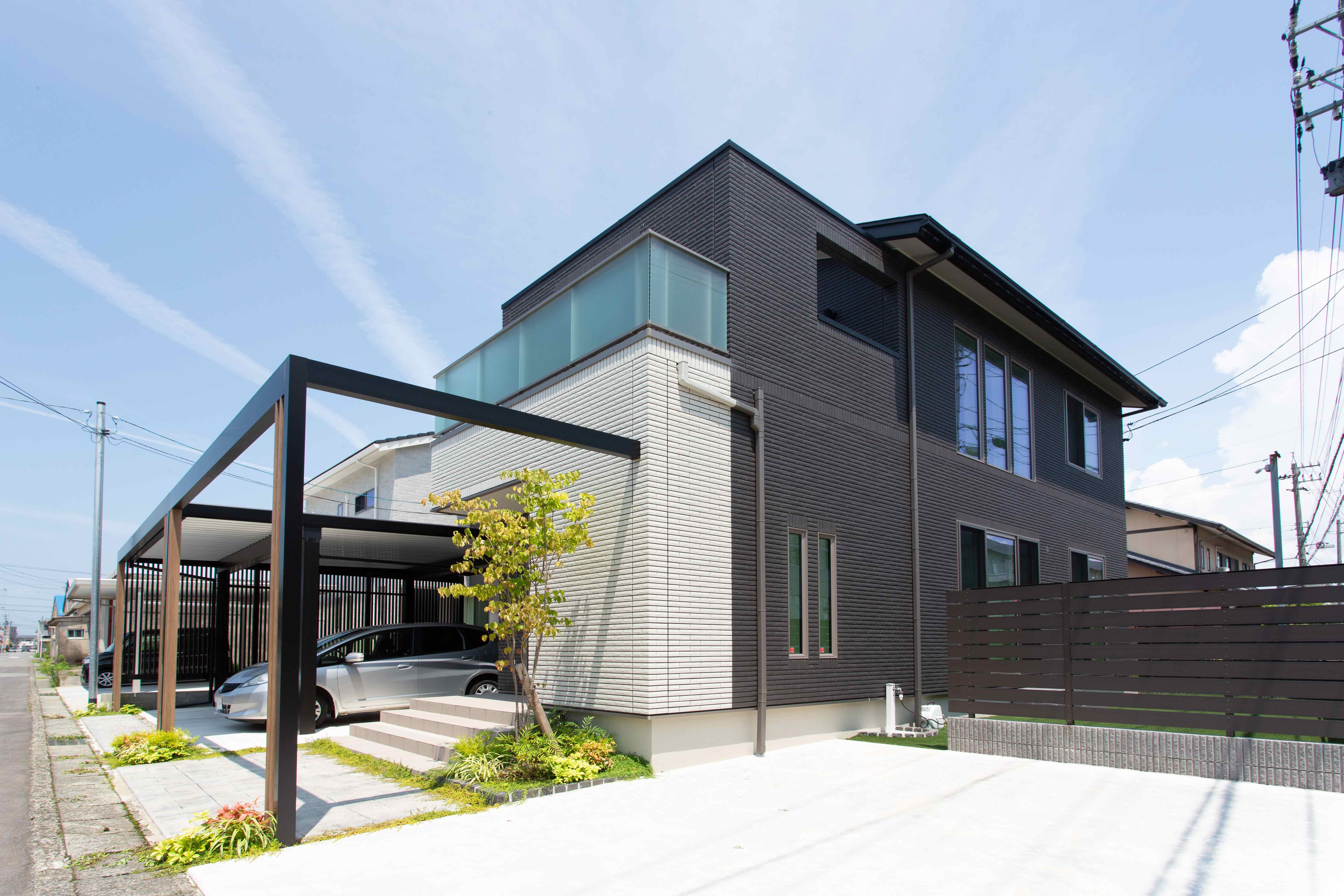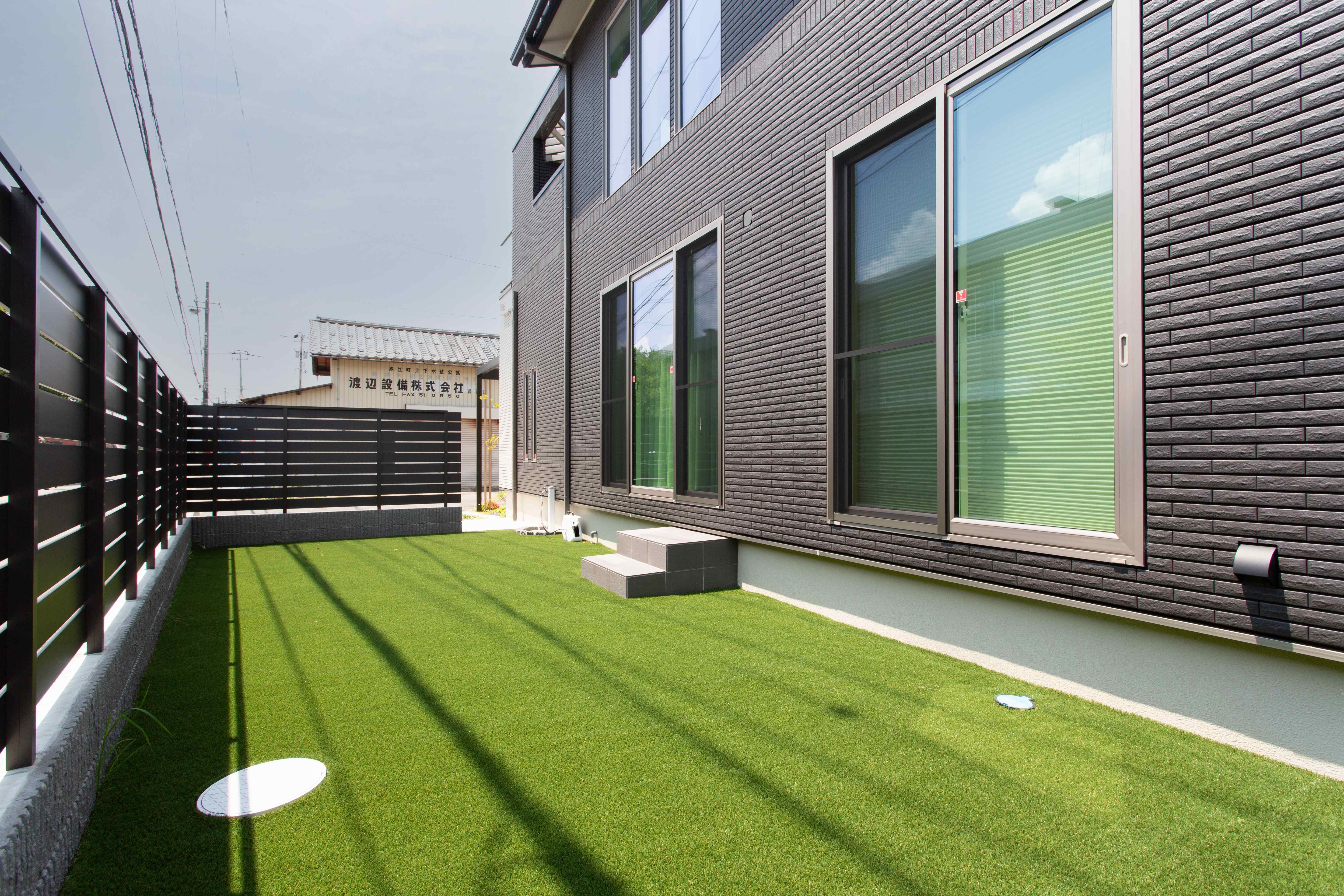 新築外構のご依頼を頂きました。 カーポートの存在感を隠し、建物との統一を図った外構デザインです。 リビングに面したお庭は目隠しフェンスとライトの設置で、防犯と安全面も考慮しながら人工芝のスペースを広めに取ったので いつでも気軽にお庭で過ごして頂けます。
