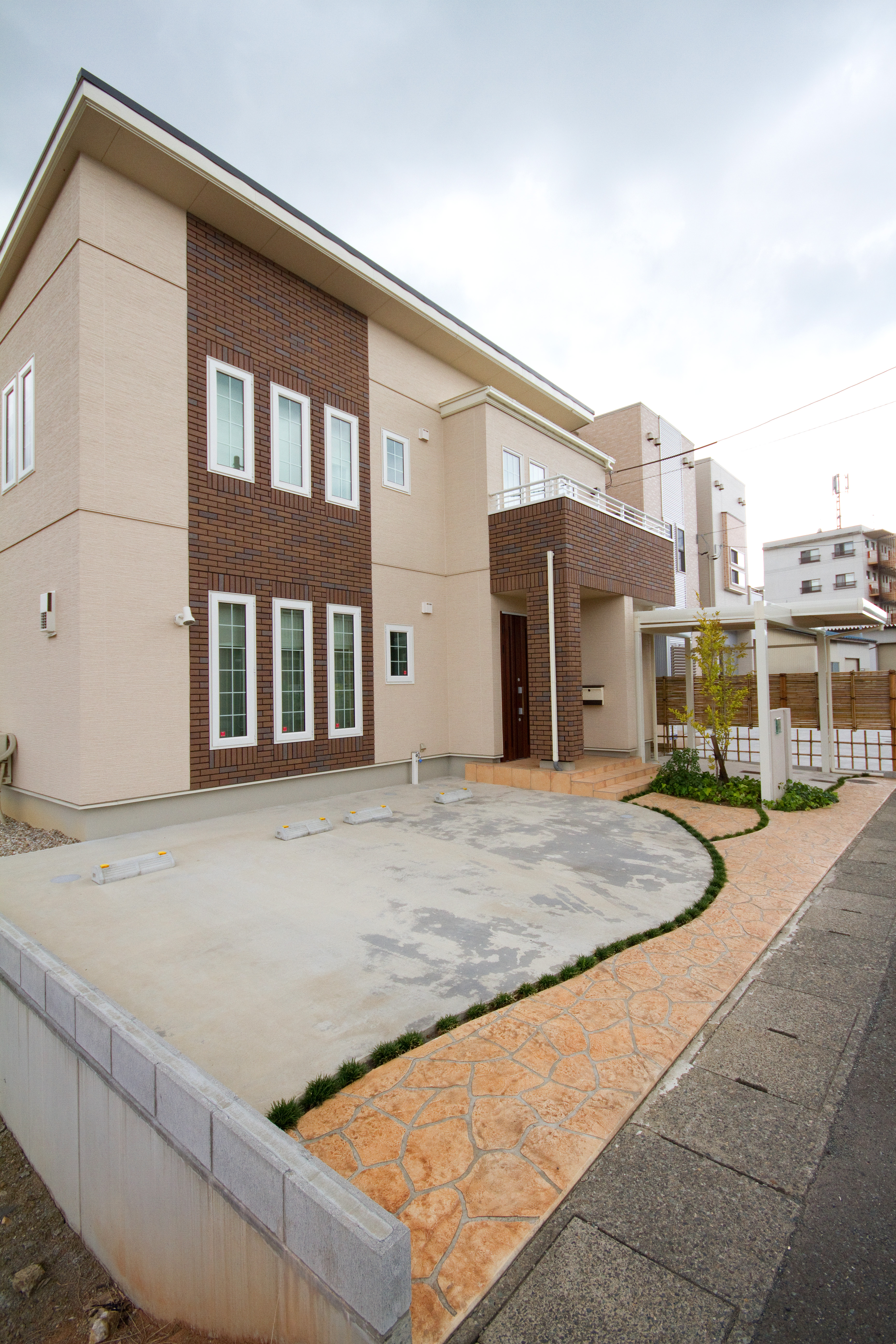 新築外構工事を施工させていただきました。アプローチはスタンプコンクリートを使い駐車場から階段へと動線を繋いだデザインになっております。こだわりの門柱はガラスの角柱を組み込み照明を照らします。ガラスの柱の中の気泡がライトアップにより幻想的なシーンとなり、癒しの空間を演出します。