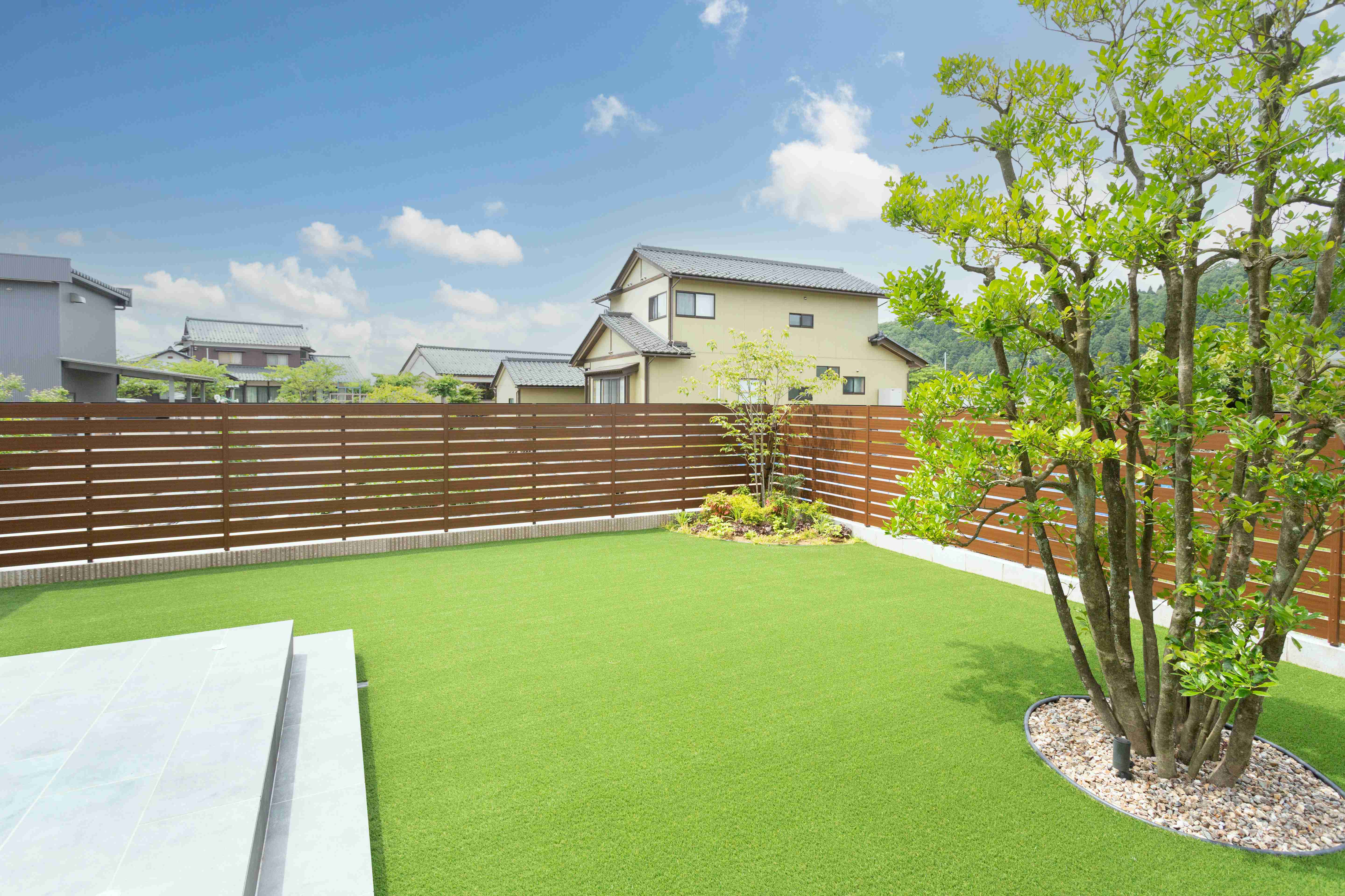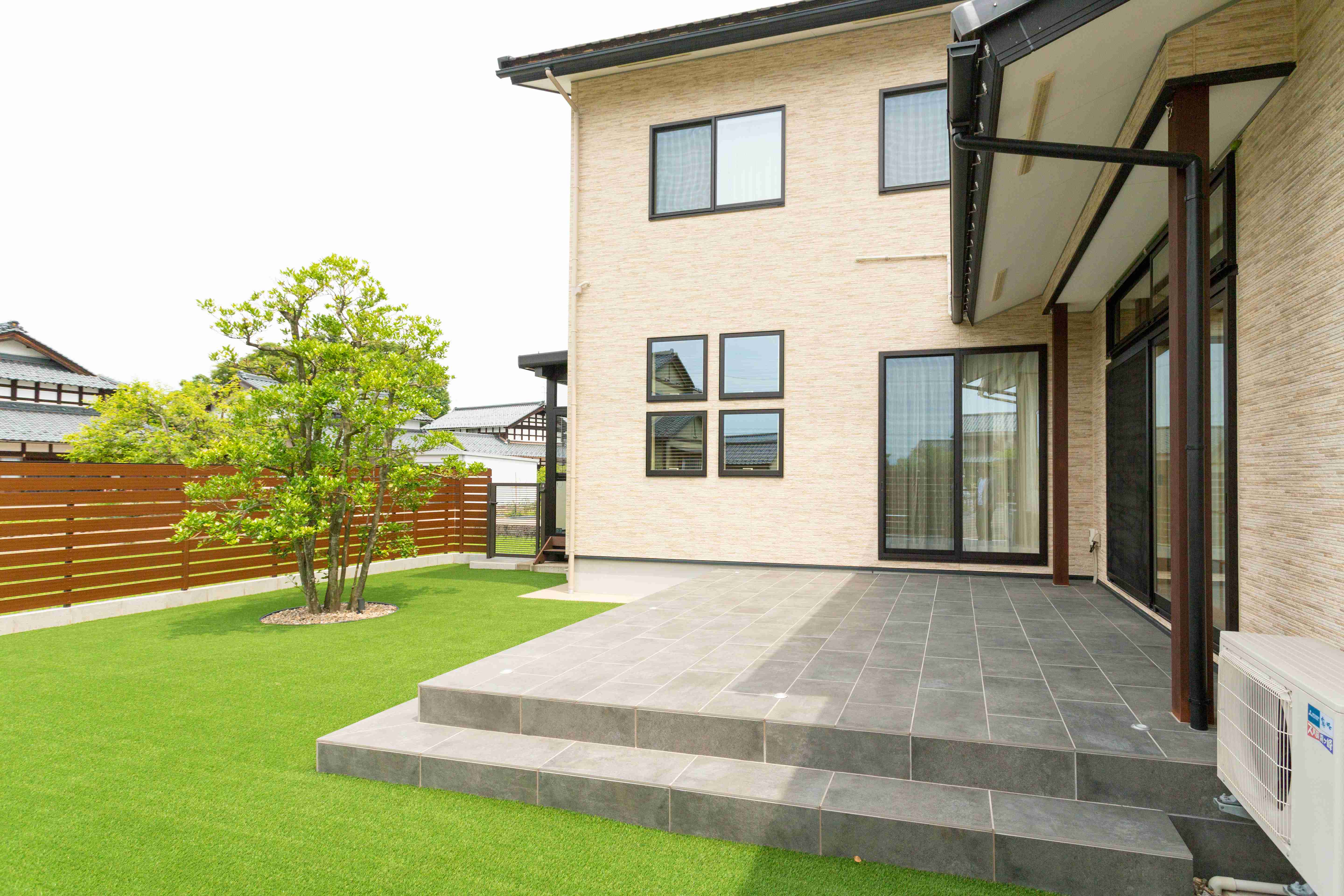 人工芝を土間スペースより20cm上げることで水はけもよく管理しやすい庭にこだわりました。