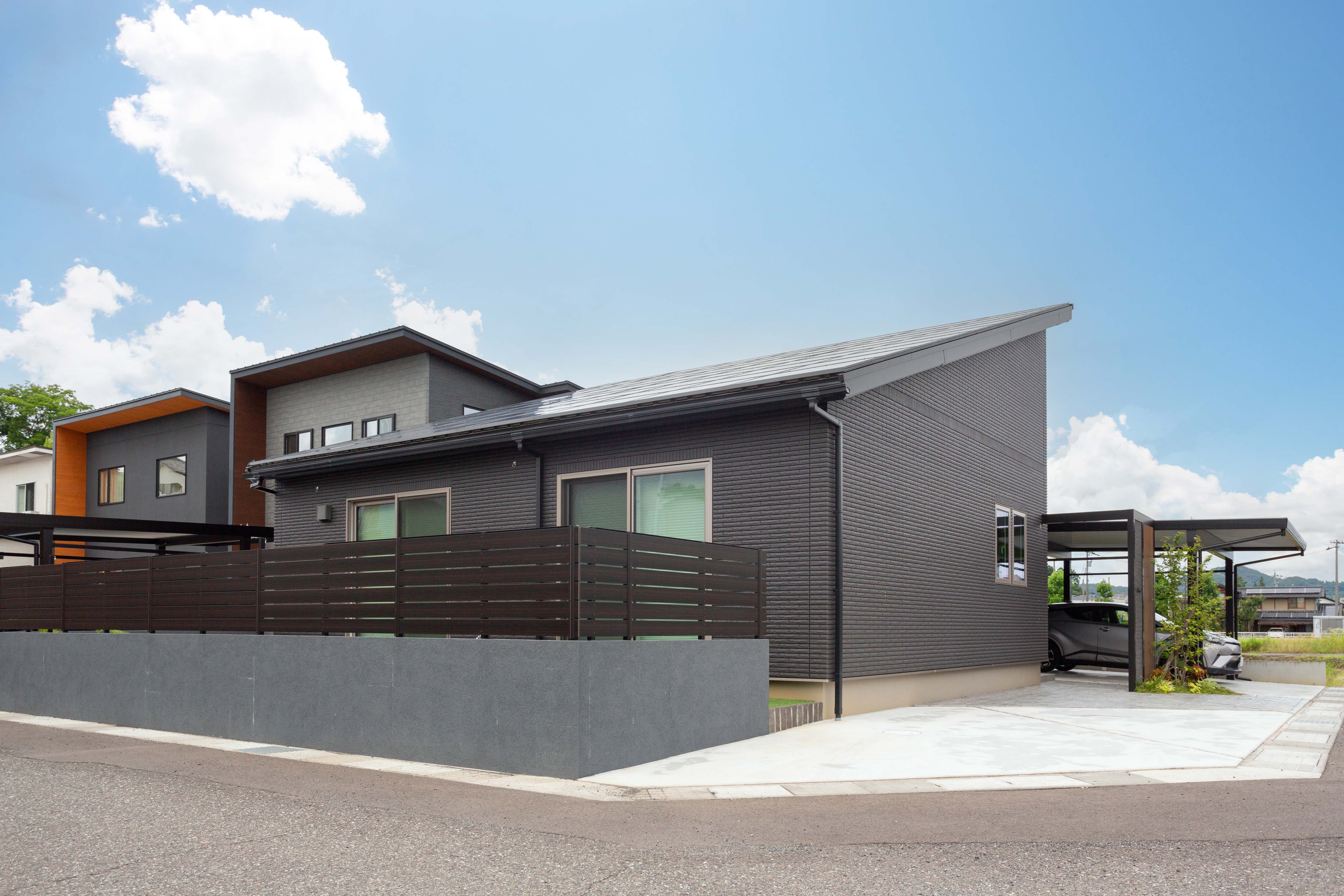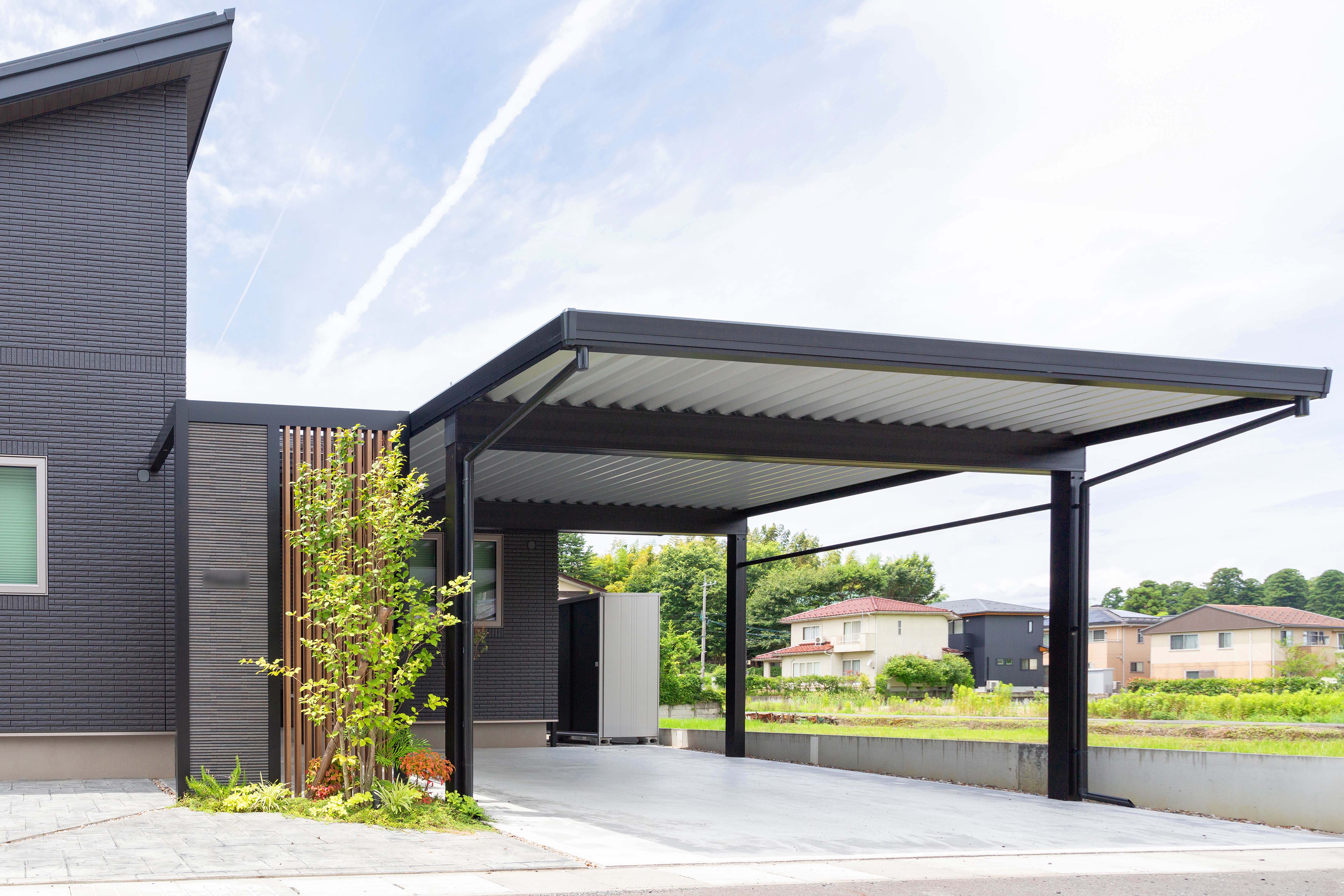 玄関前にはカーポートと一体感のあるファサードを設置。