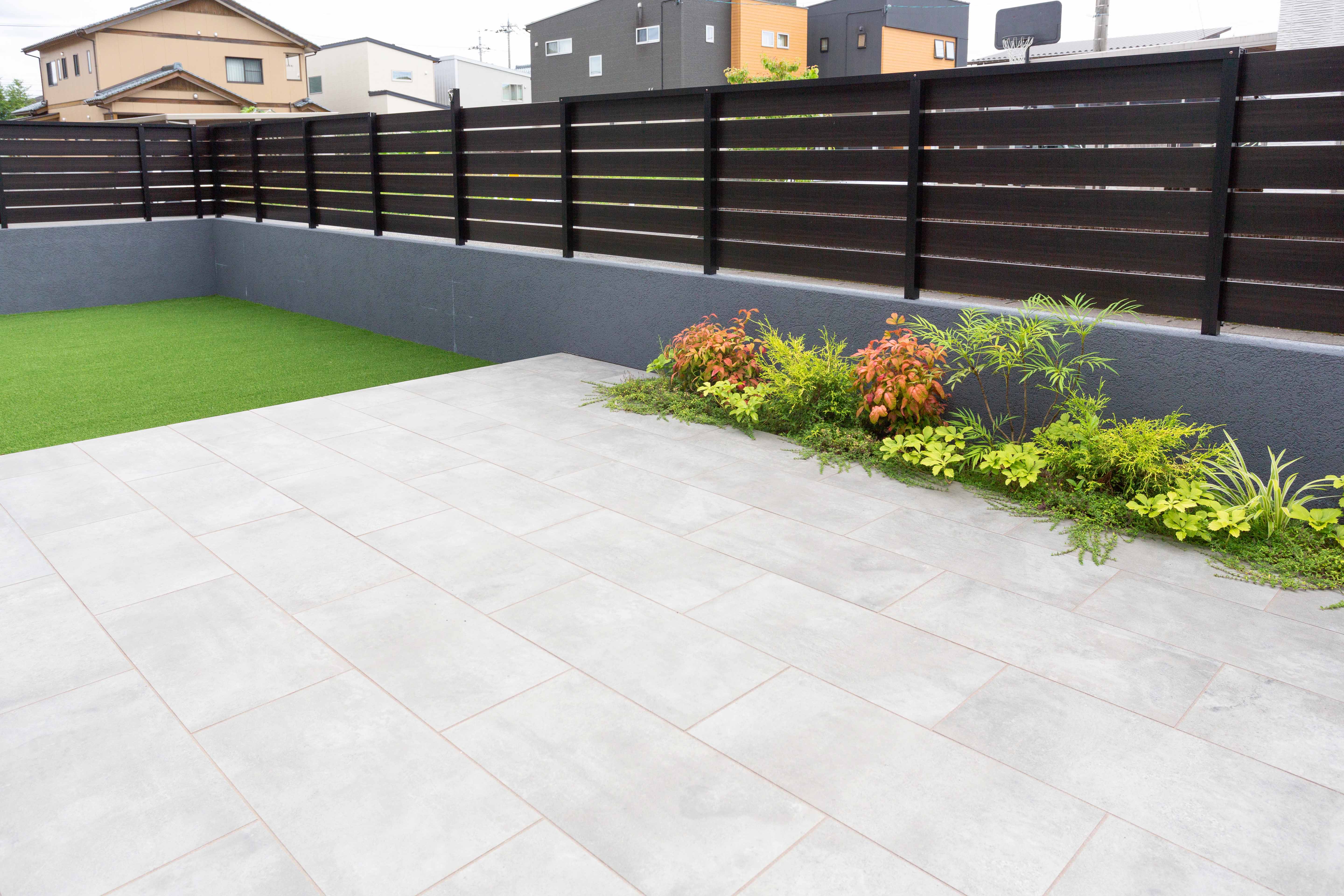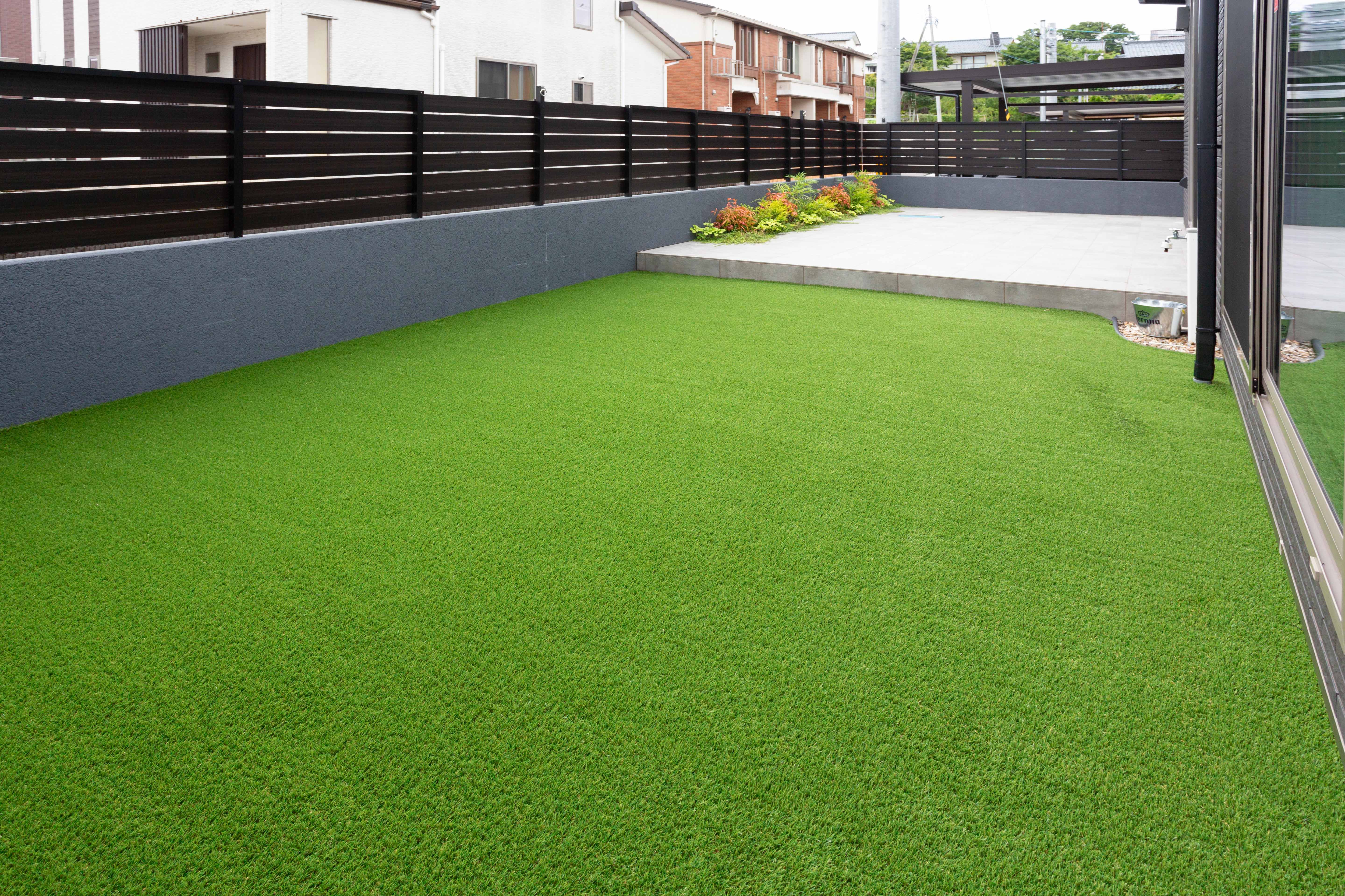 お庭スペースは人工芝とタイルデッキで仕上げました。