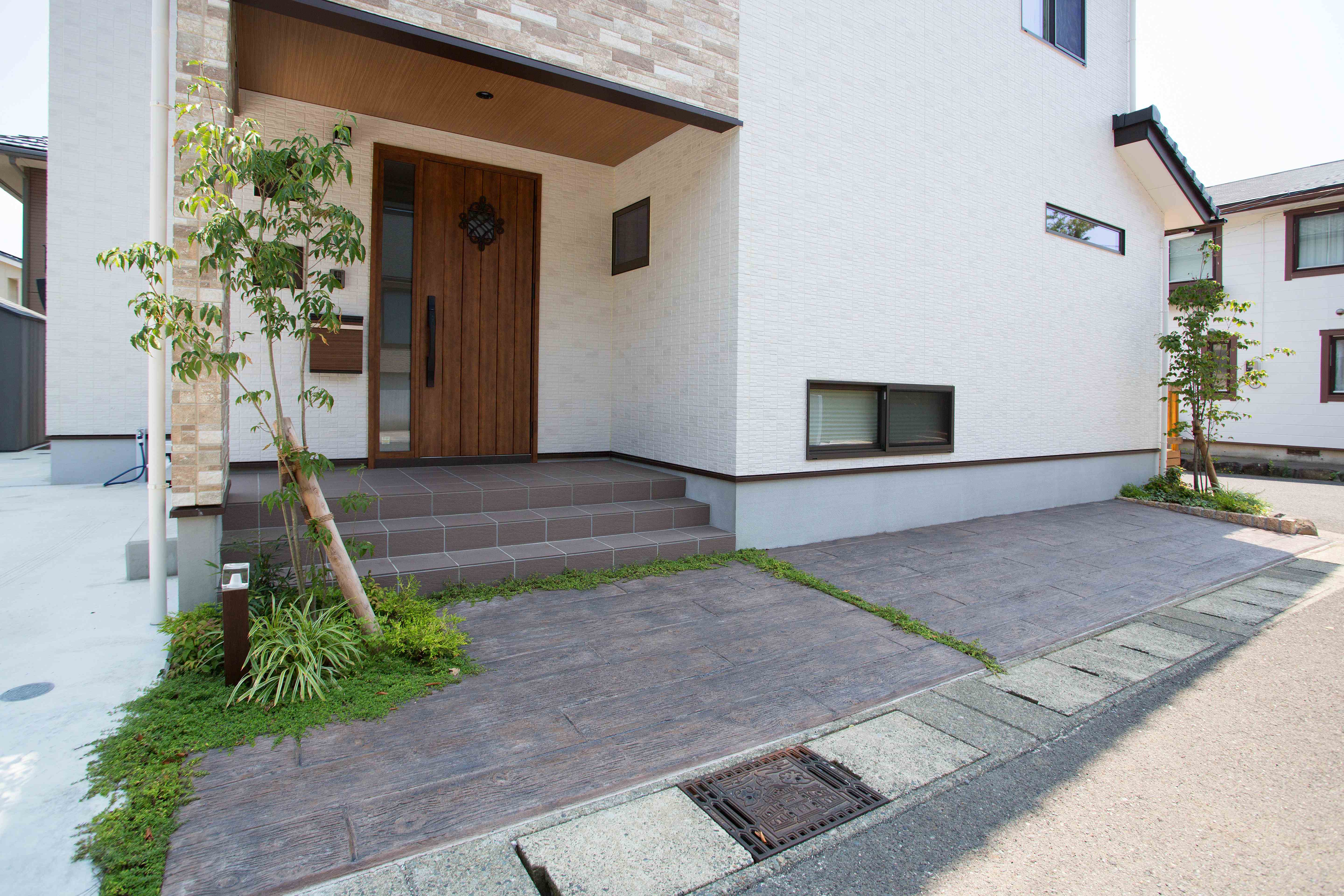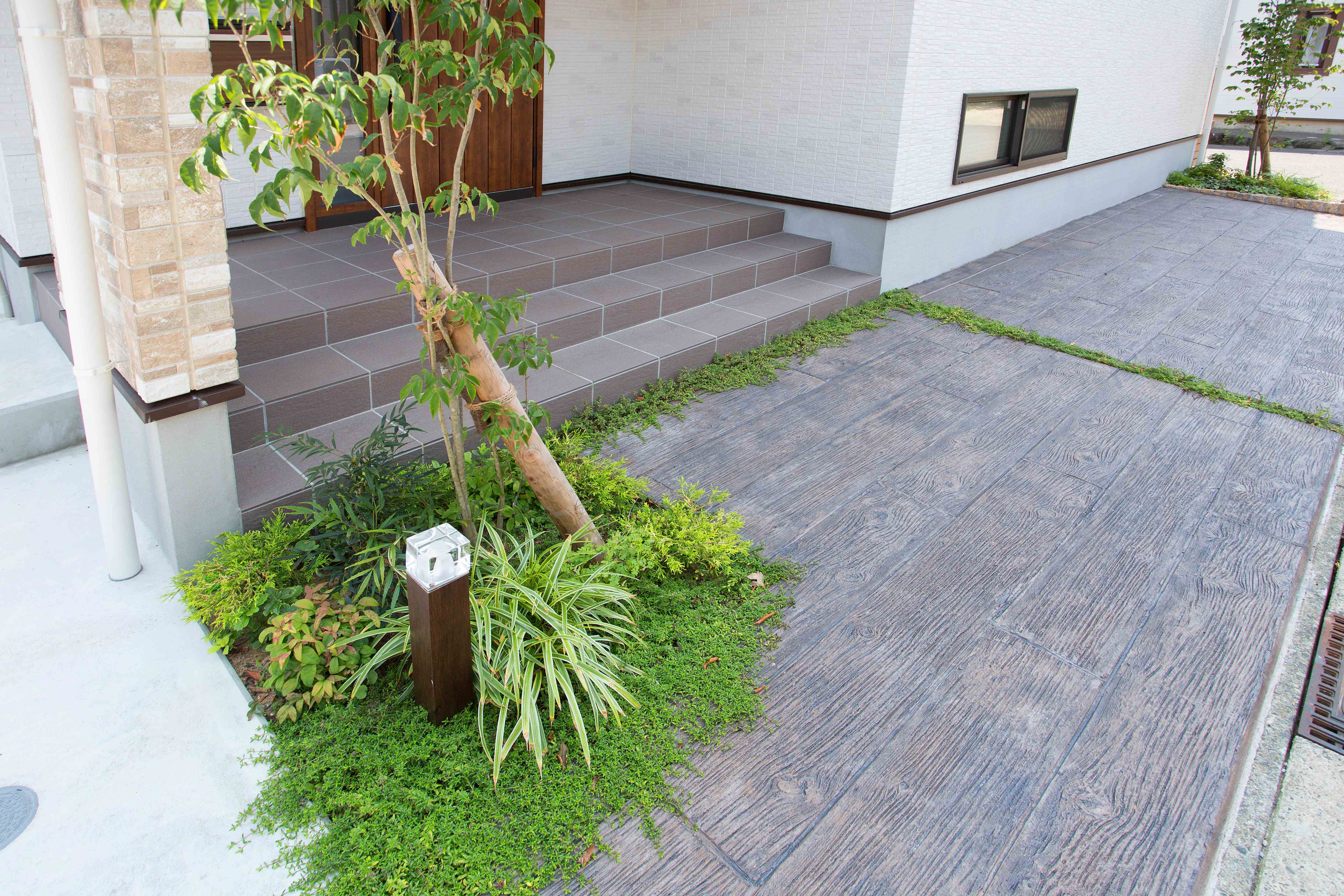 カースペースを兼ねたアプローチは耐久性とデザイン性の高いスタンプコンクリートを使用し、