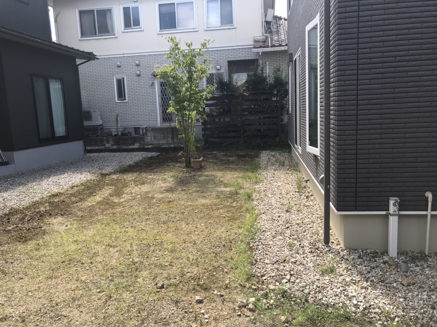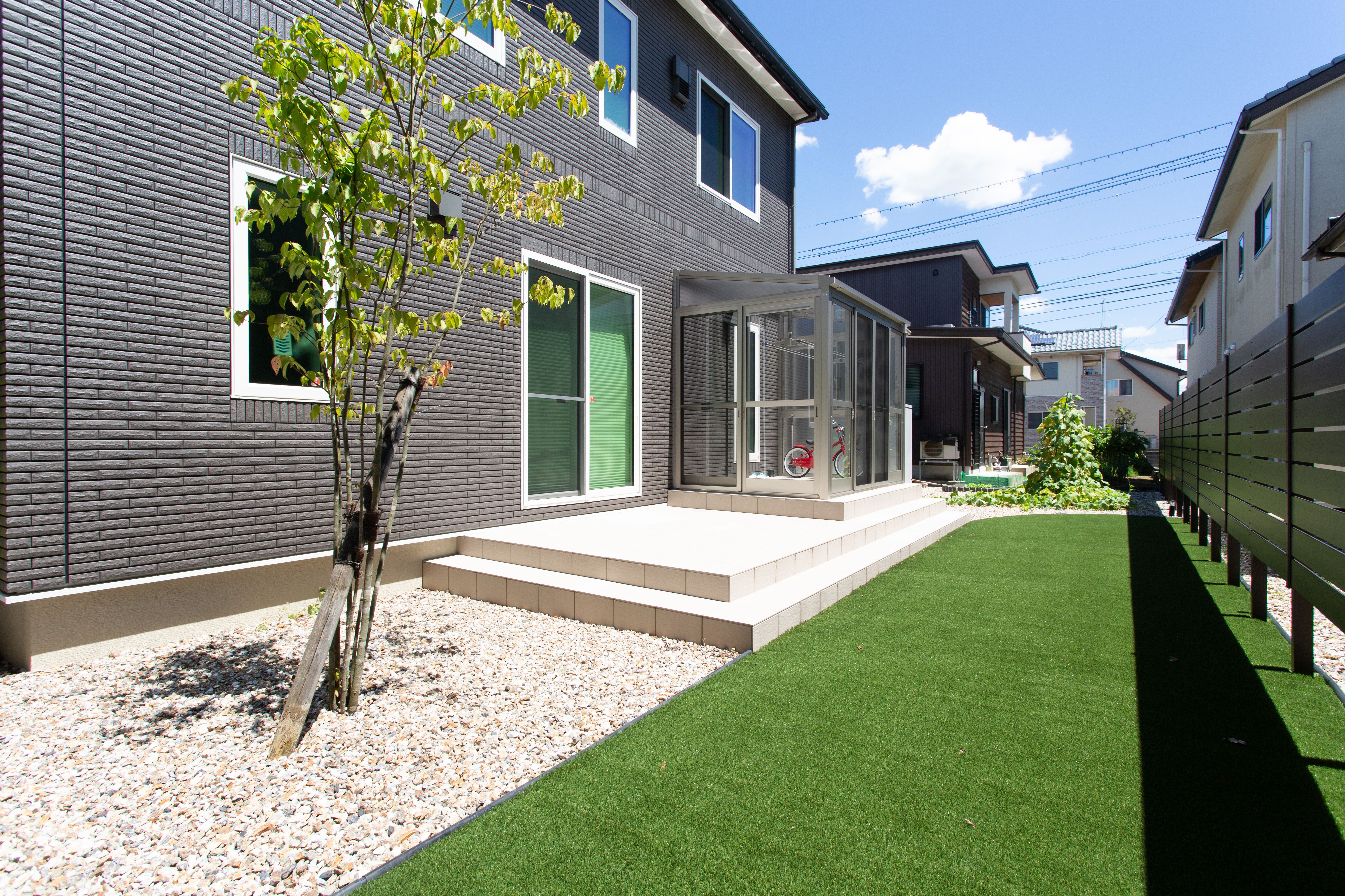 裏庭の勝手口に物置間物干し、+α多目的スペースとしてのサンルームをご希望でした。 中からの出入りを簡単にするために、タイルデッキで床を上げて使いやすいスペースを確保しました。 隣地からの目隠しフェンスと人工芝で実用的なプライベート空間へ。