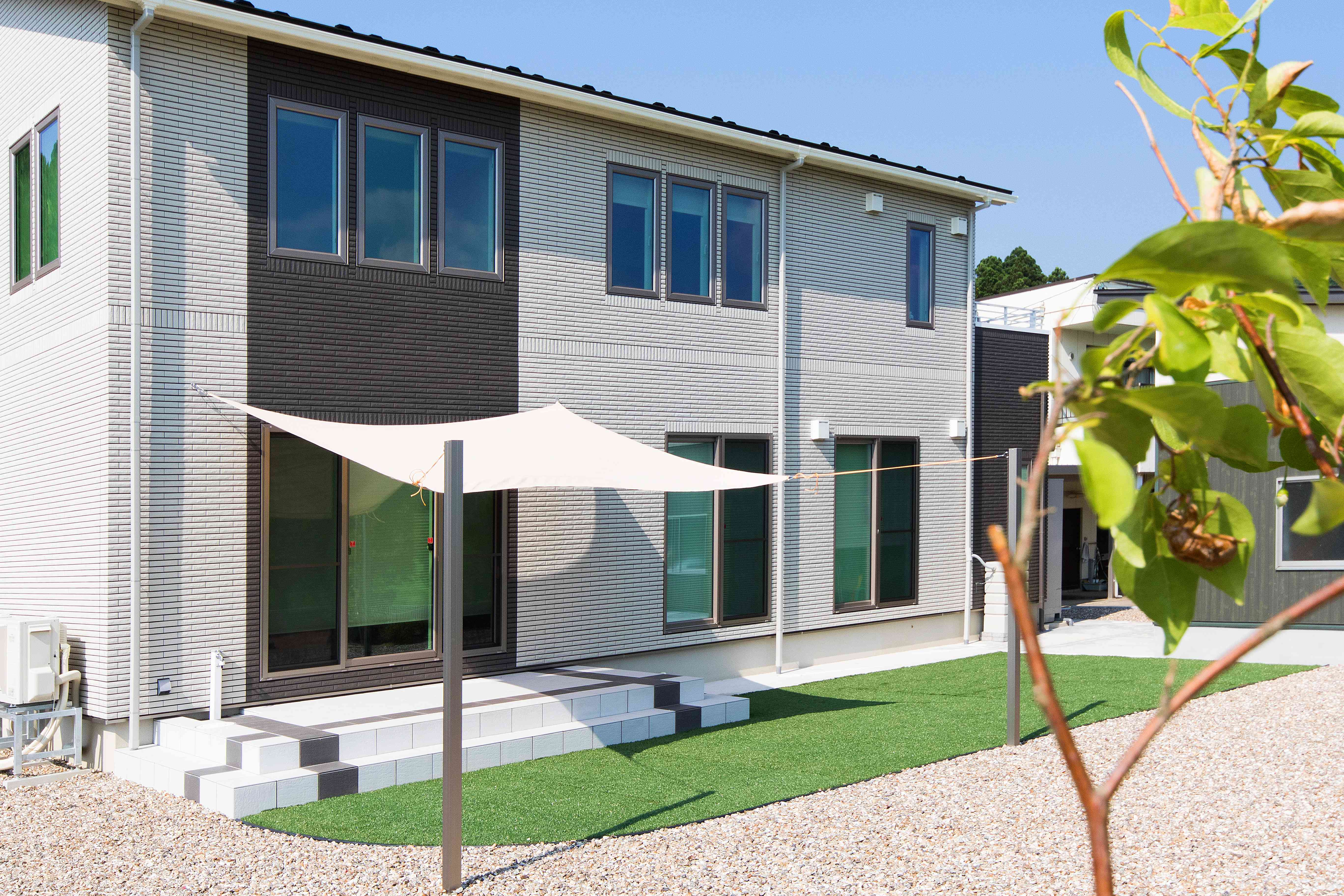 広々としたお庭部分は、タイルテラスと人工芝、日よけのシェードも取付させて頂きました。