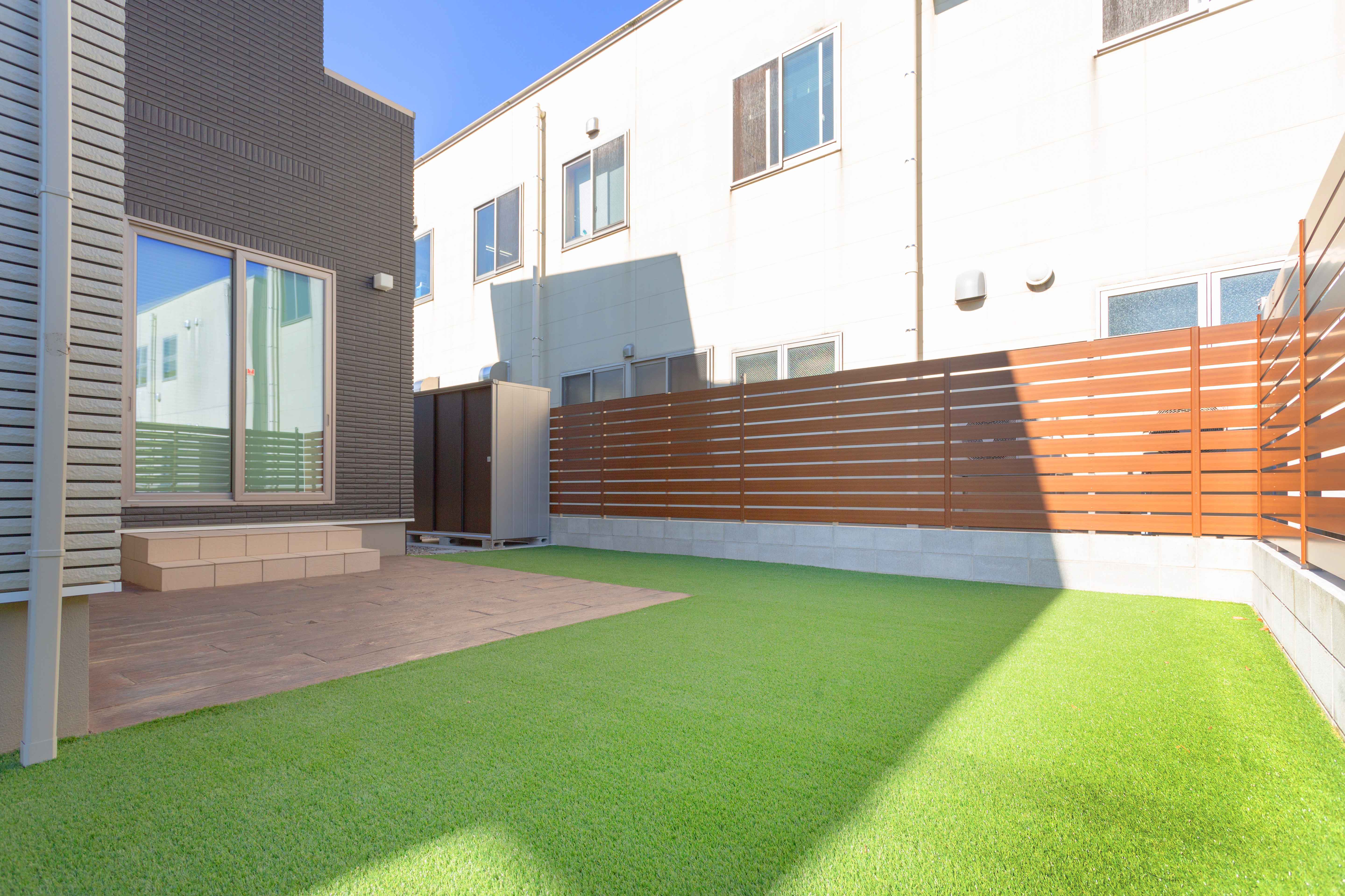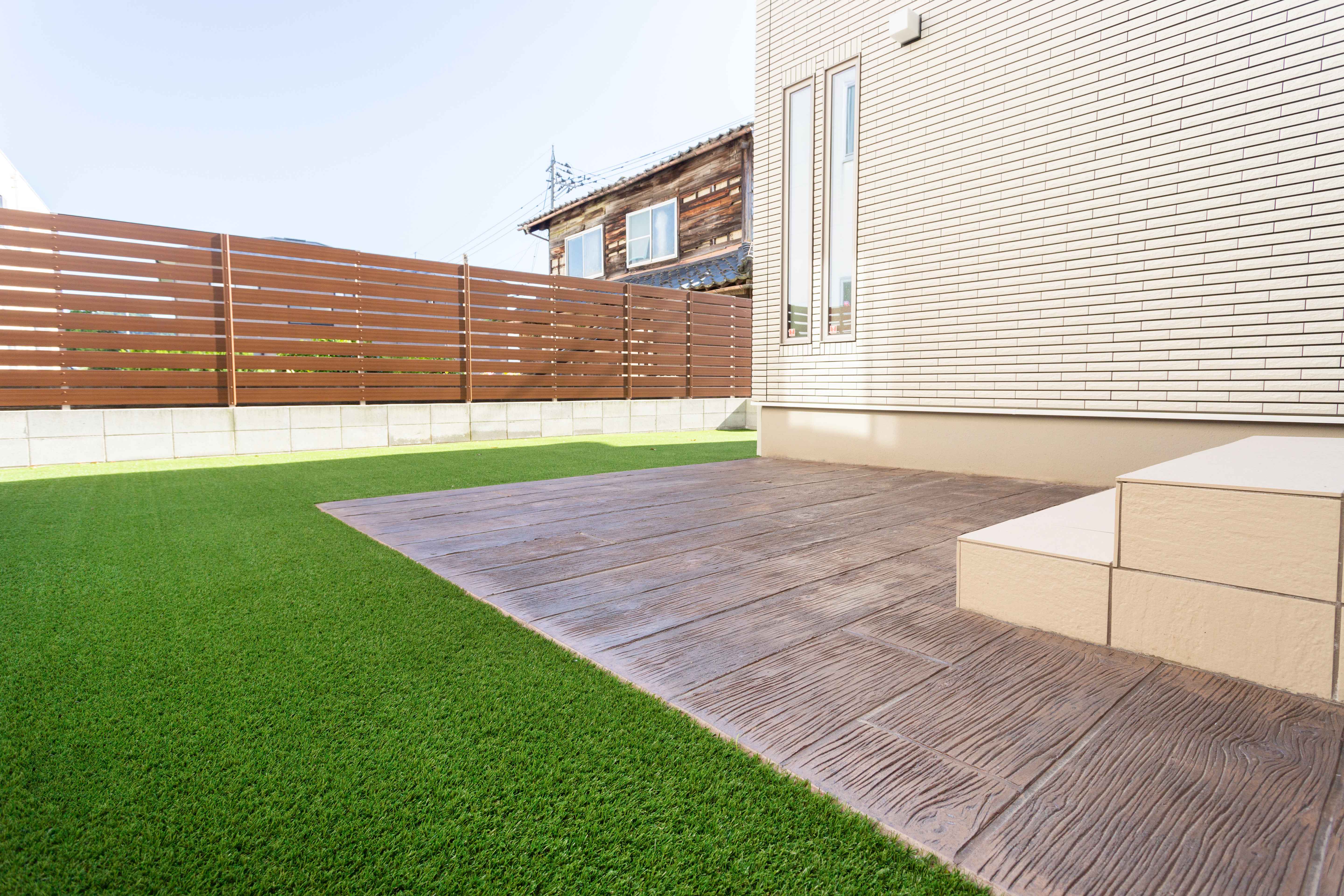 また、スタンプコンクリートのBBQスペースを人工芝とフラットにつくる事で