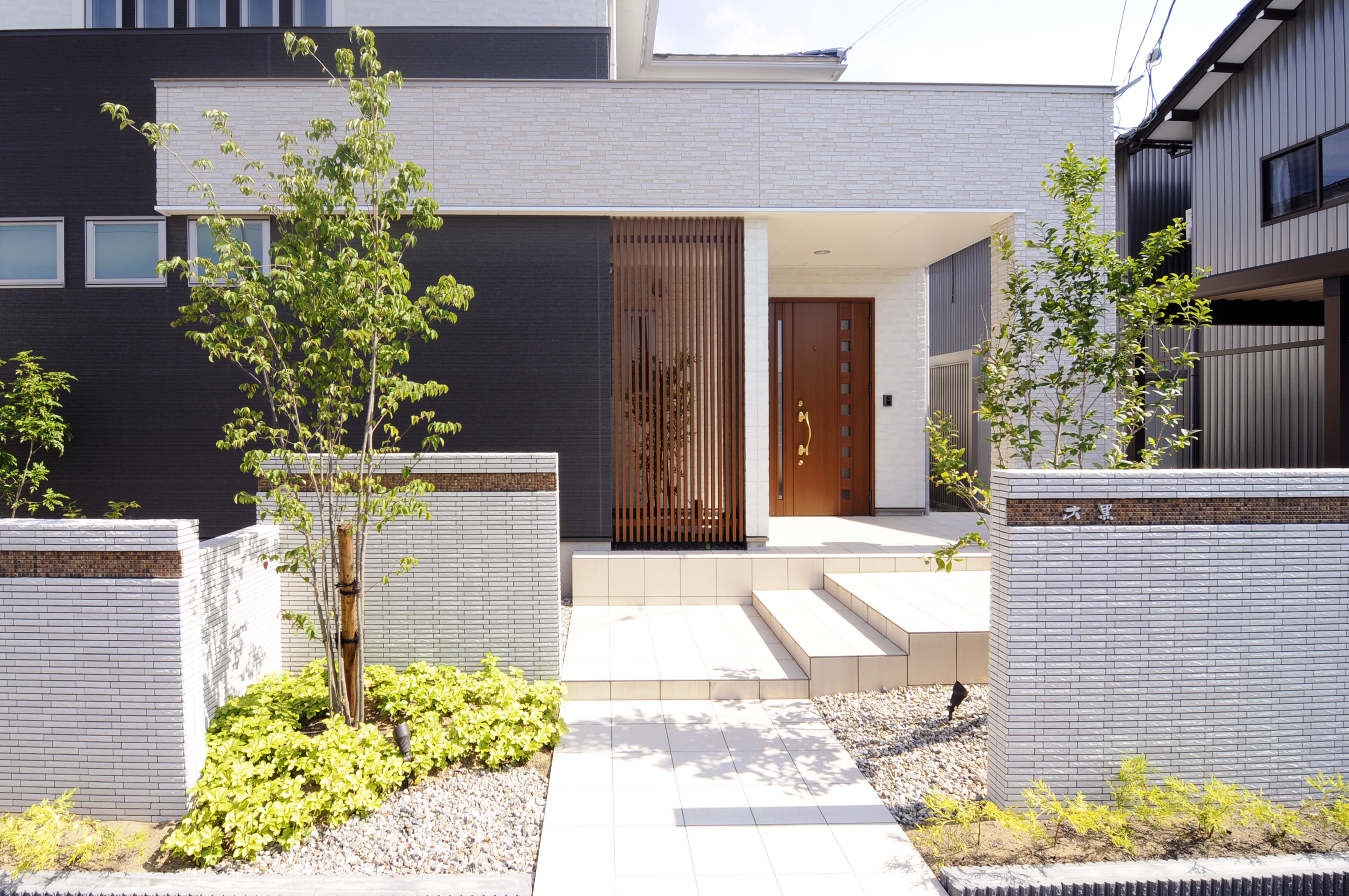 前庭の施工プランで元々の建物をグレードUPさせるエクステリアのご提案でした。 もちろん玄関の目隠しや、植栽のバランス、色空間など統一感のあるデザインに仕上げ、家の前の塀(モニュメント)は、横一線のブラウンのラインは玄関と外庭の格子に併せたモザイクタイルを使用。 動線を平板で作る事により、デザイン性のあるスタイリッシュで高級感のあるエクステリアに仕上がりました。