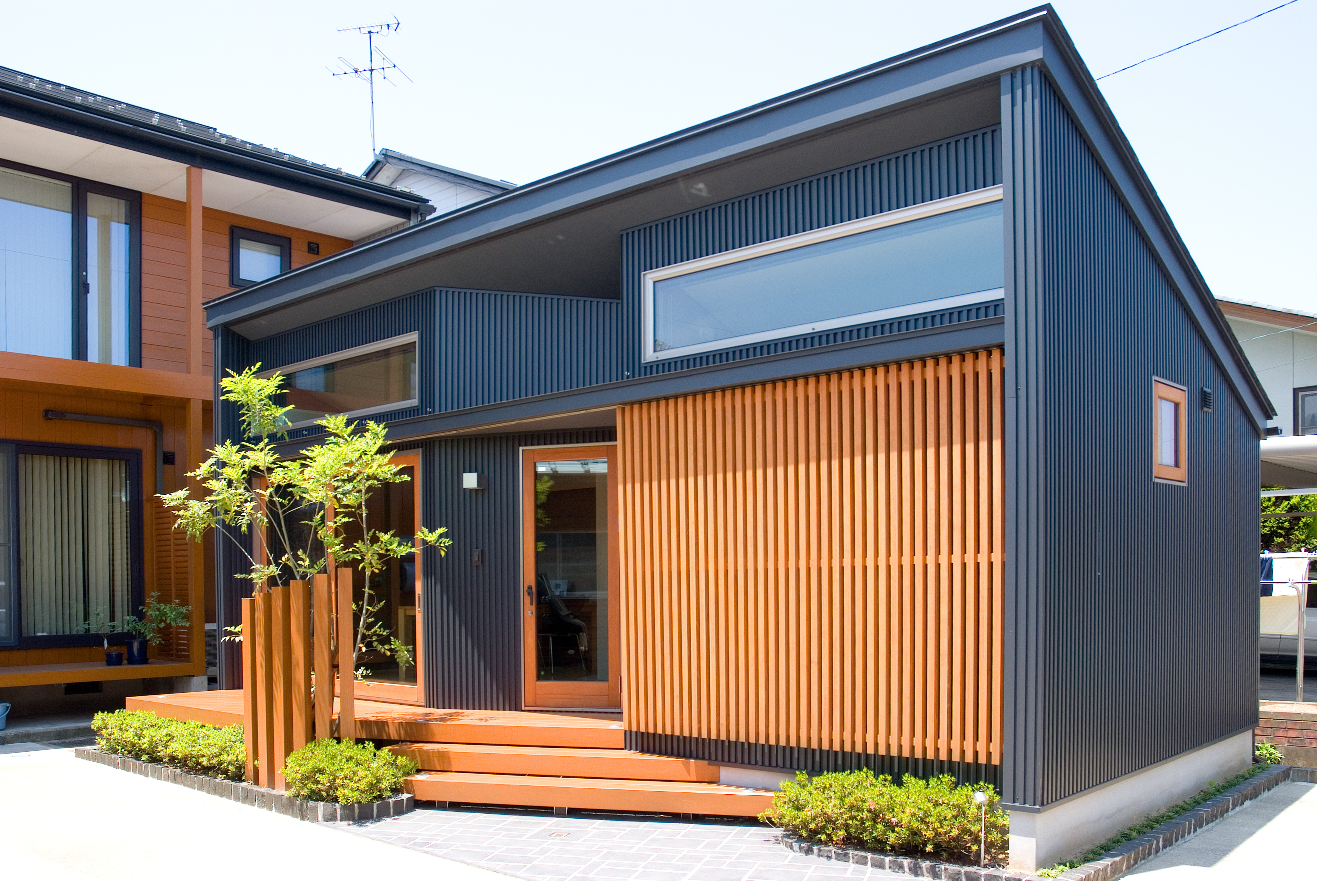 スタイリッシュなお家の玄関前をよりナチュラルに演出したデザインの提案です。 狭い空間にウリン材を使いアクセントの色を合わせシンボルツリーを配置することにより、柔らかい雰囲気がより一層お家を映えさせます。