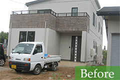レンガを使用しシンプルなデザインで続くエントランスへの階段と、建物の周りには南条砂利をひいて色の統一と防犯を考えて施工しました。