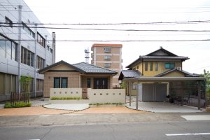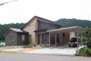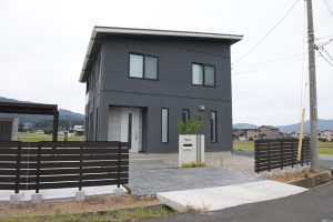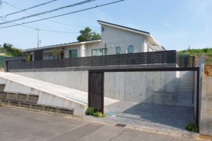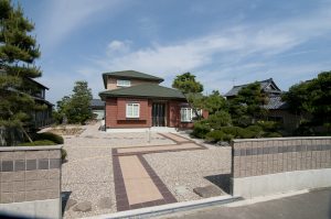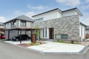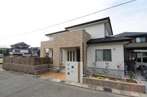 お客様のご希望によりシンプルなデザインのエクステリアです。正面からは、雨風を完全に防ぐ事の出来るカーポートや優しいラインのレンガでまとめた花壇が特徴的です。玄関に近づくと美しいガラスの入ったモニュメントにガラスの表札が入っています。夜はガラスが光り綺麗なエントランスを演出します。