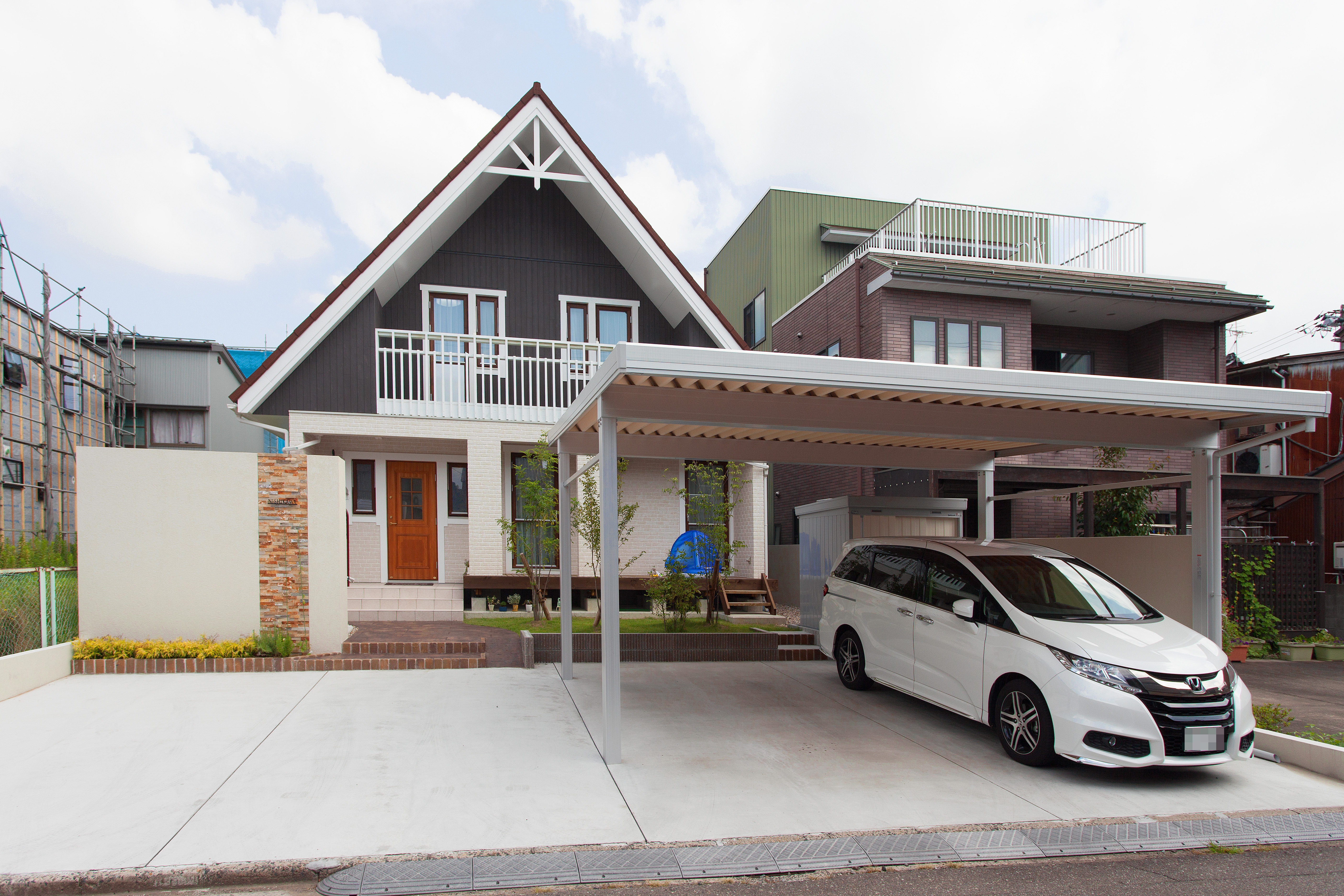 三角屋根が印象的な住宅の雰囲気に合わせて、色や植栽にこだわり仕上げた新築外構。
