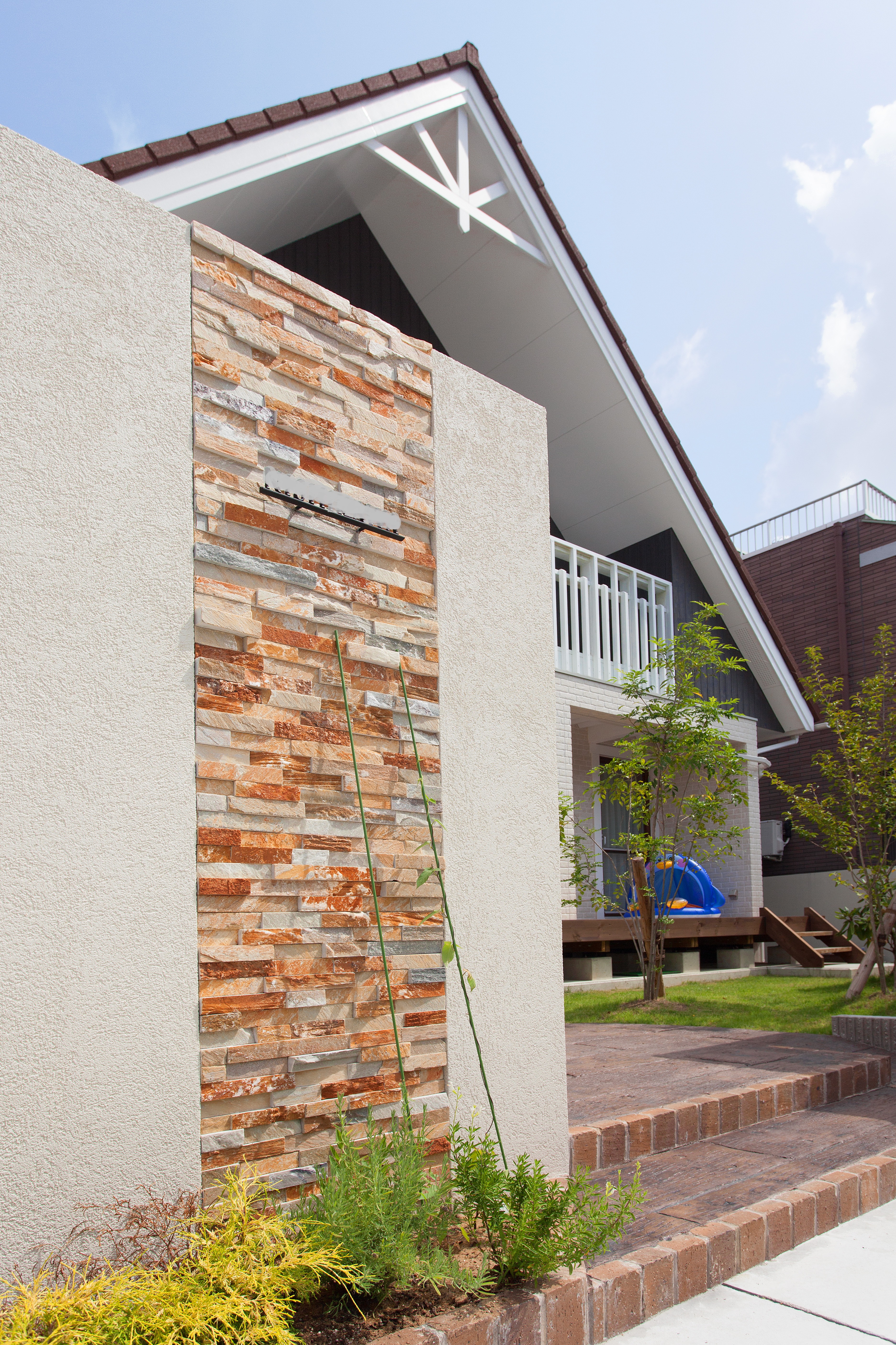 玄関へ誘うモニュメントは白をベースに自然石を施したデザインにして、階段の蹴上に使用しているレンガと色を合わせてコーディネート。モニュメントの裏側にはテラス屋根を取り付けて自転車を置くスペースを確保。さらに、階段の横に自転車を引いて上がれるよう小さなスロープを設置しました。窓の前に大きめのシンボルツリーを植えることで道路からの視線が気にならない工夫も。