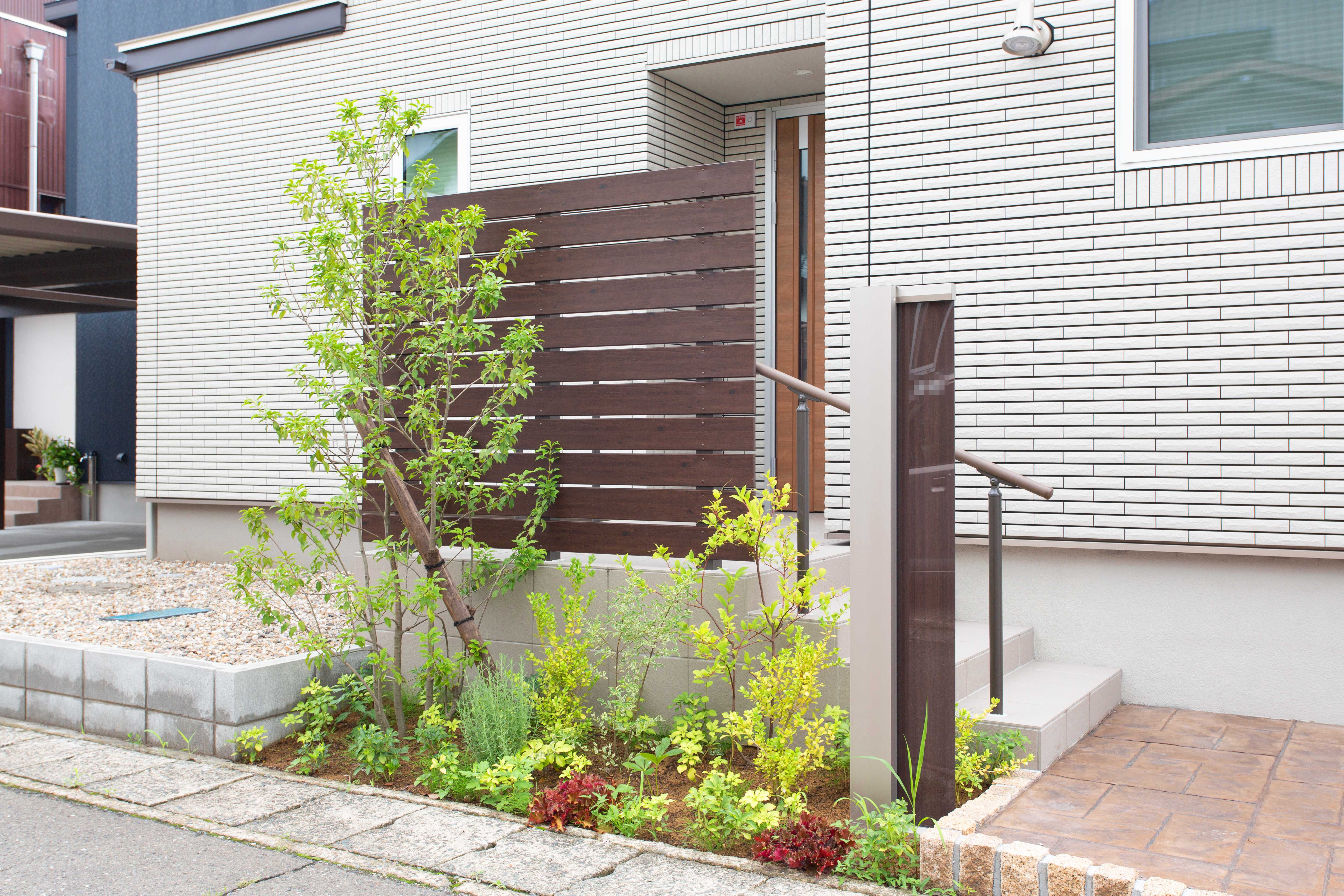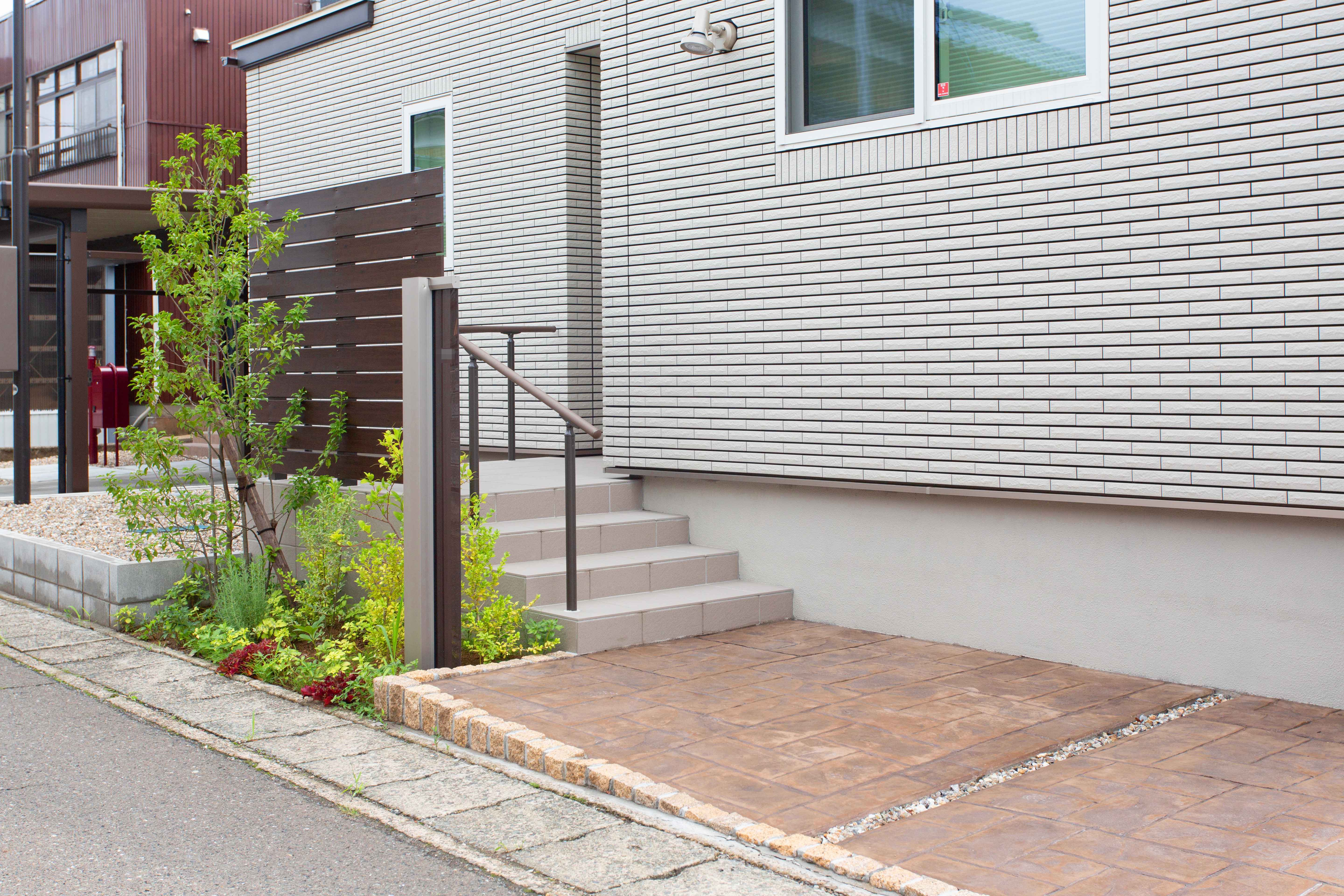 玄関の中が見えない様に植栽とフェンスで自然な仕上がりにしました。 主張しすぎないシンプルな門柱や、スタンプにピンコロ石での縁取り等 可愛らしくナチュラルなエントランスが素敵ですね。