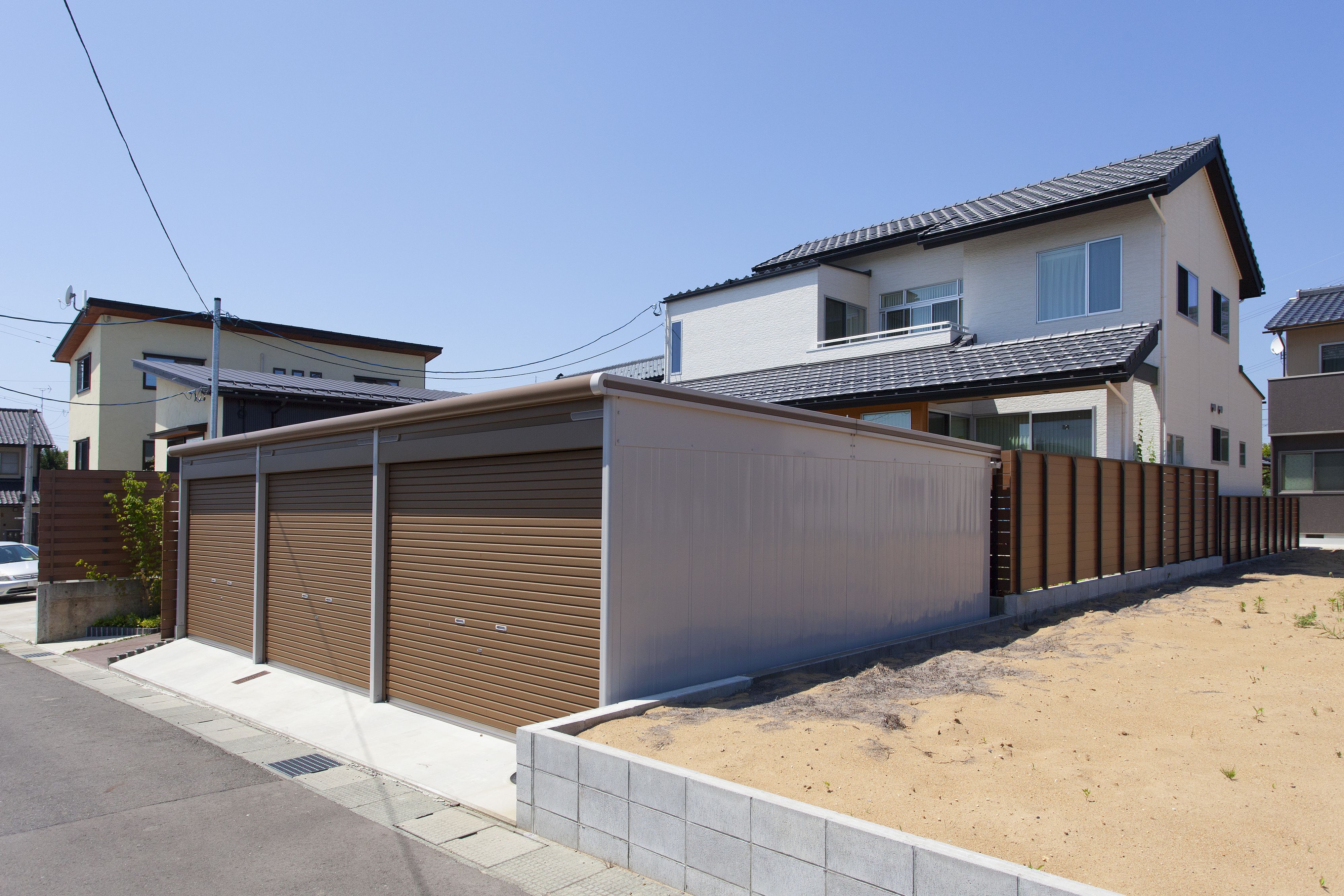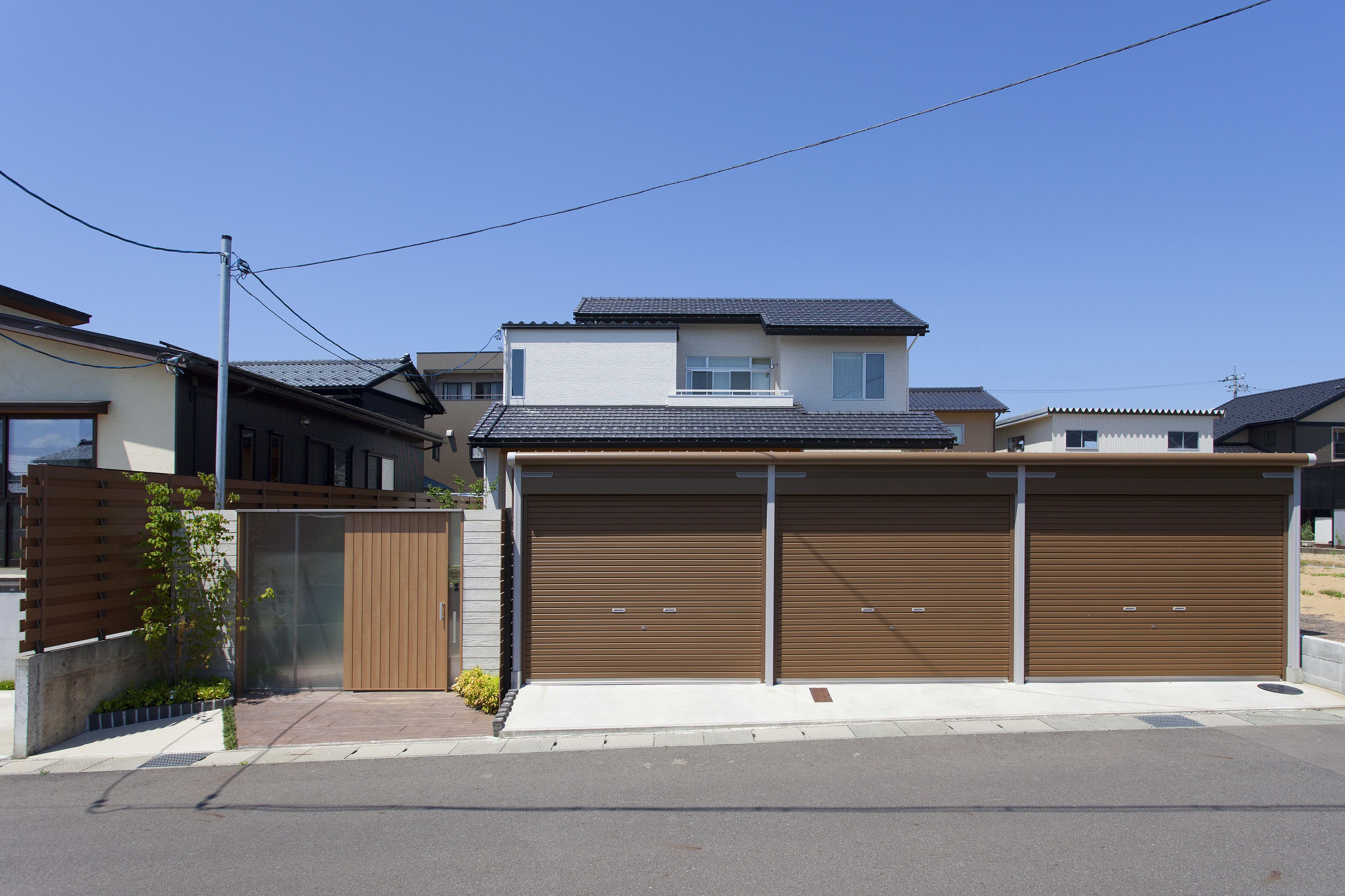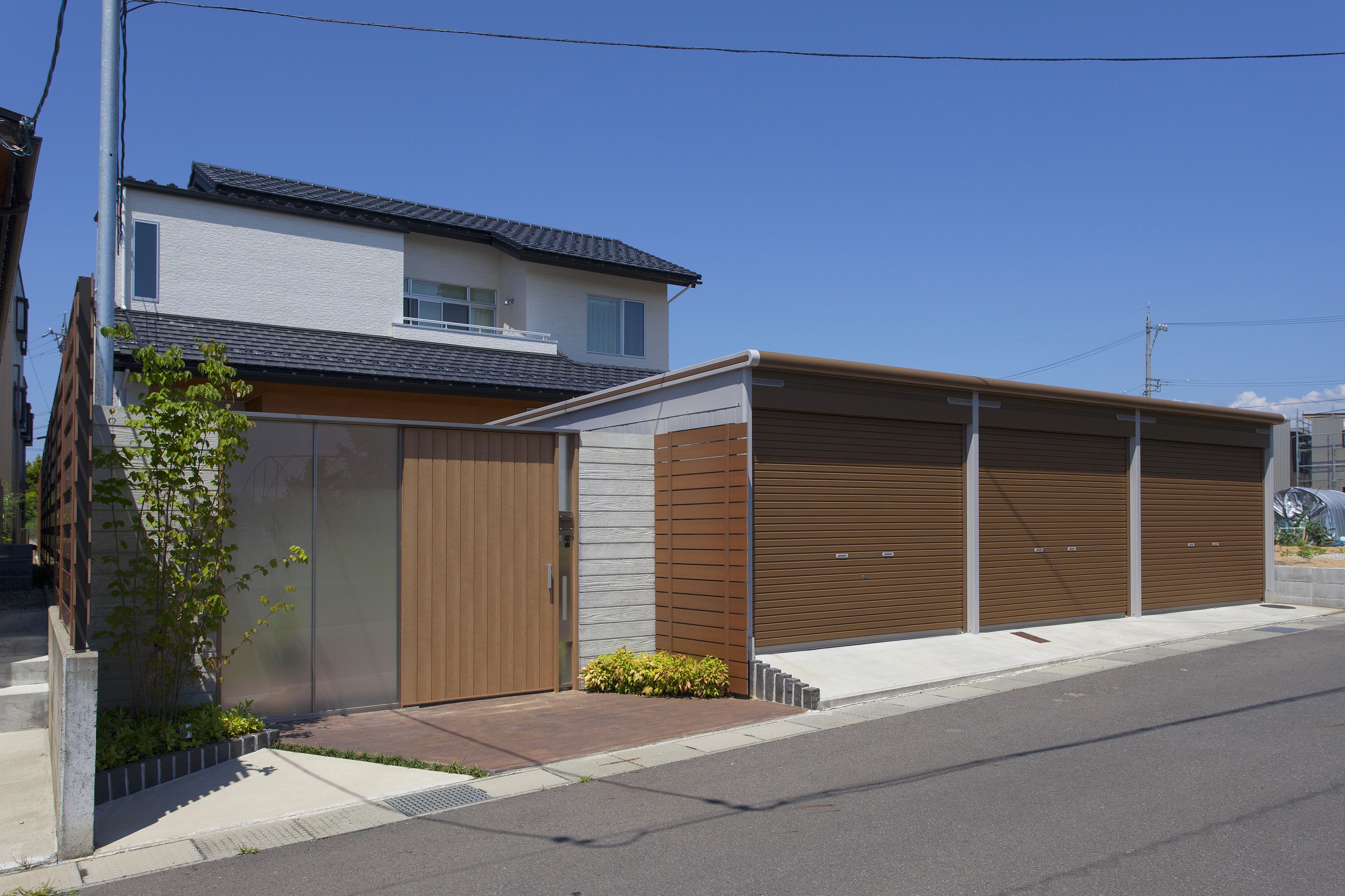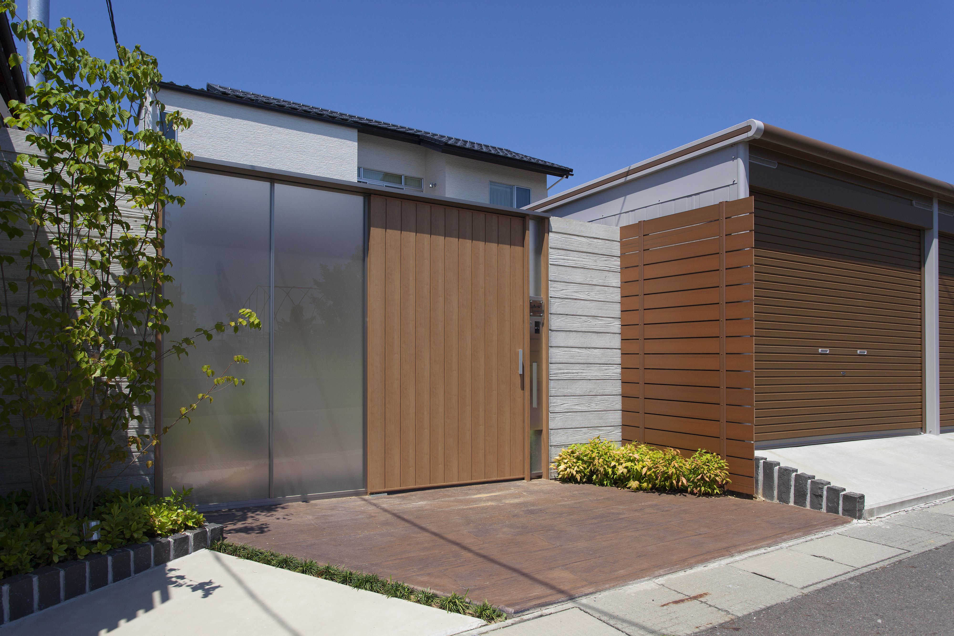 車庫を兼ねた3連倉庫と、LIXILのダブルエントランスで門周りを囲いました。