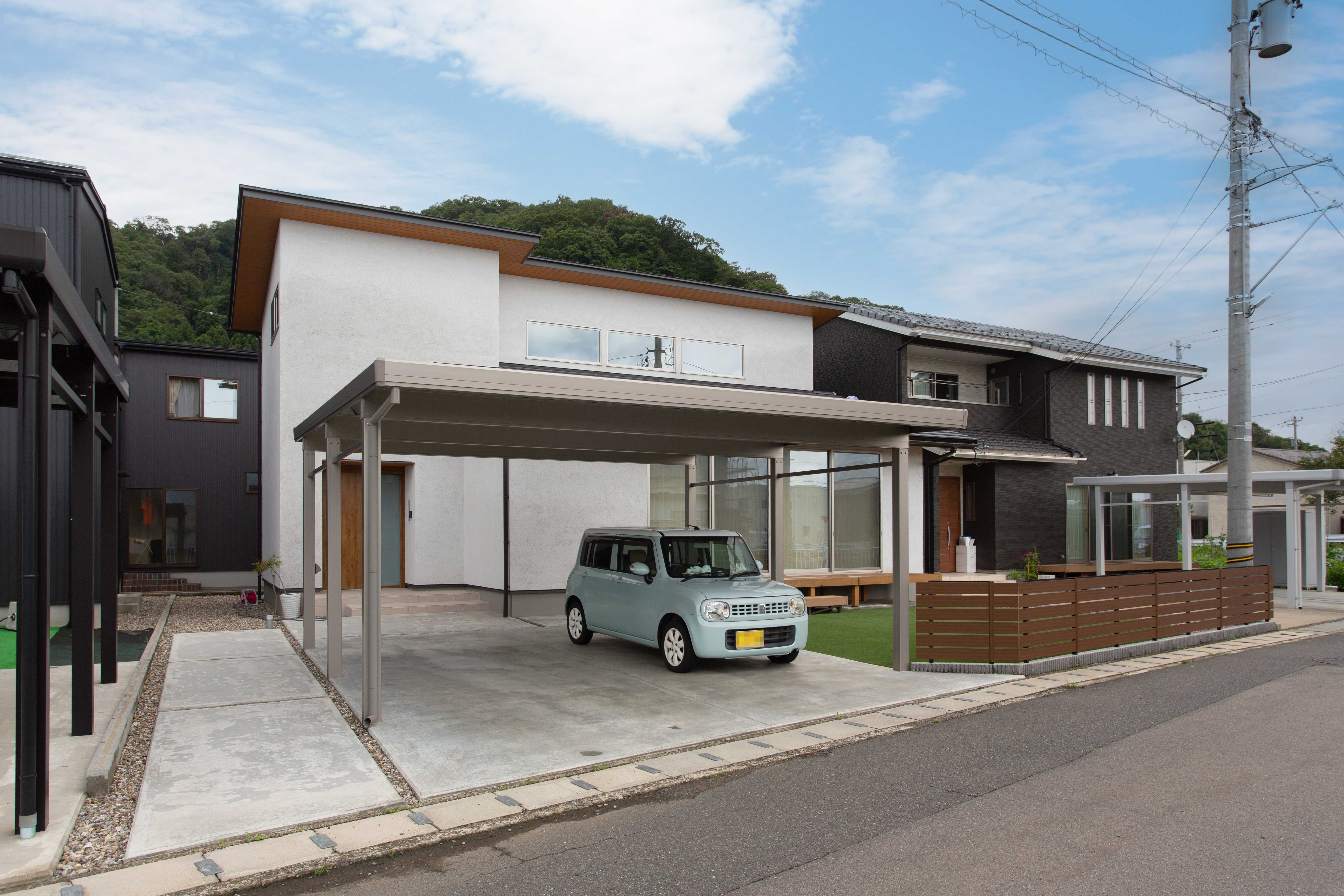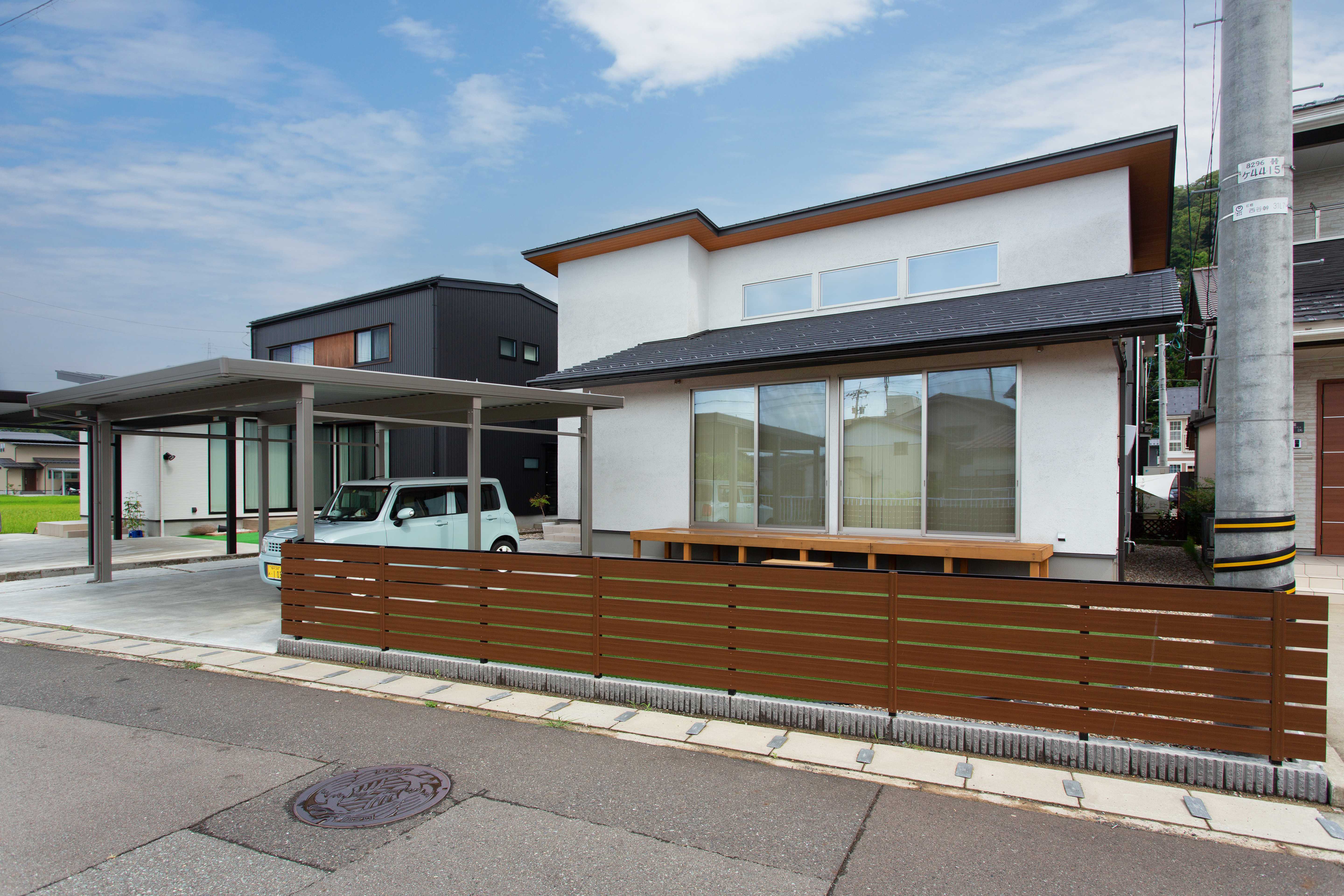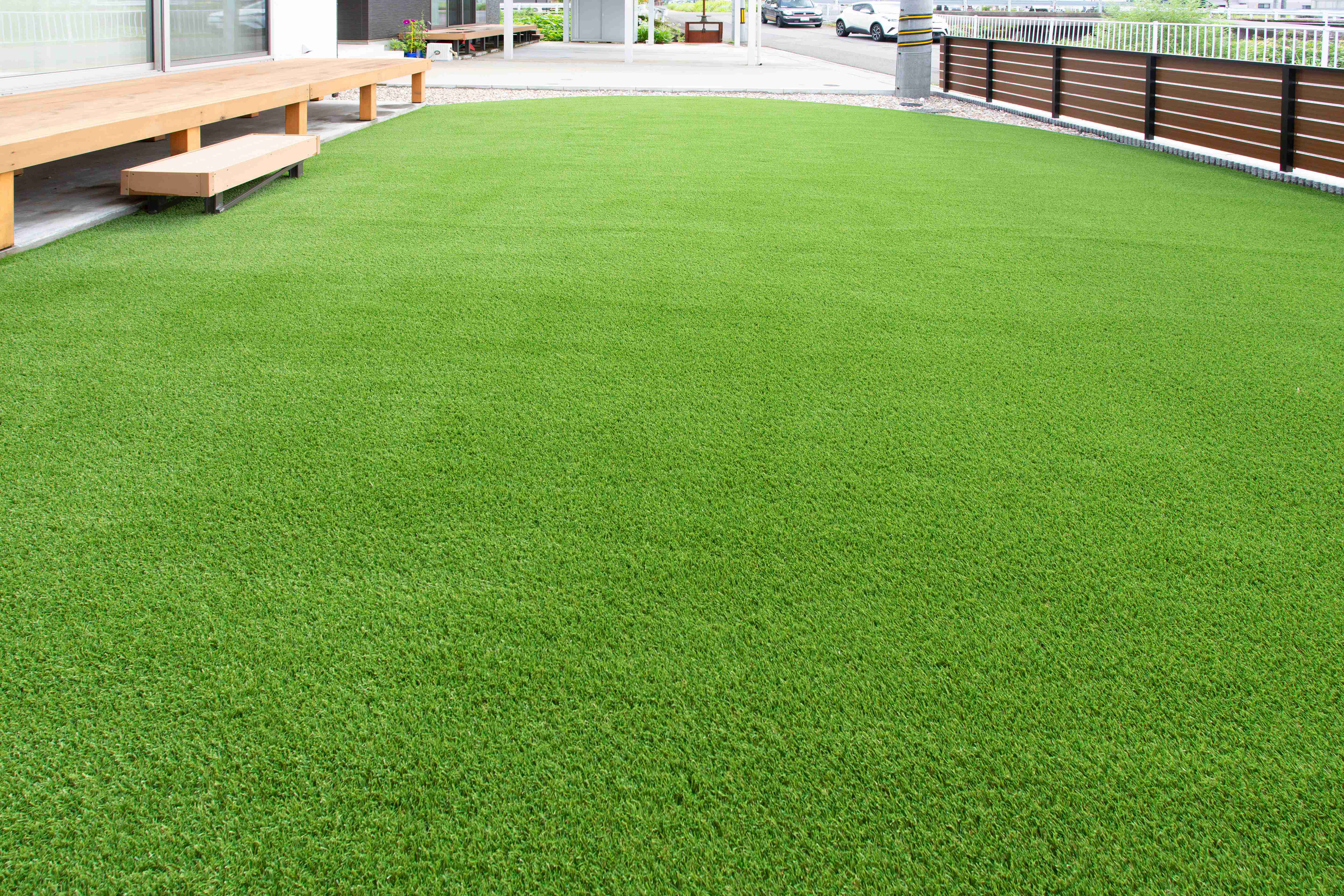 子供と遊べる広々としたお庭は人工芝に、 道路側はウッドフェンスで囲い安心して遊べる空間に仕上がりました。 忙しい子育て世代はお庭の手入れも大変です。 人工芝や防草シートに南条砂利を敷いたサービスヤードは メンテナンスも楽々でお勧めです。