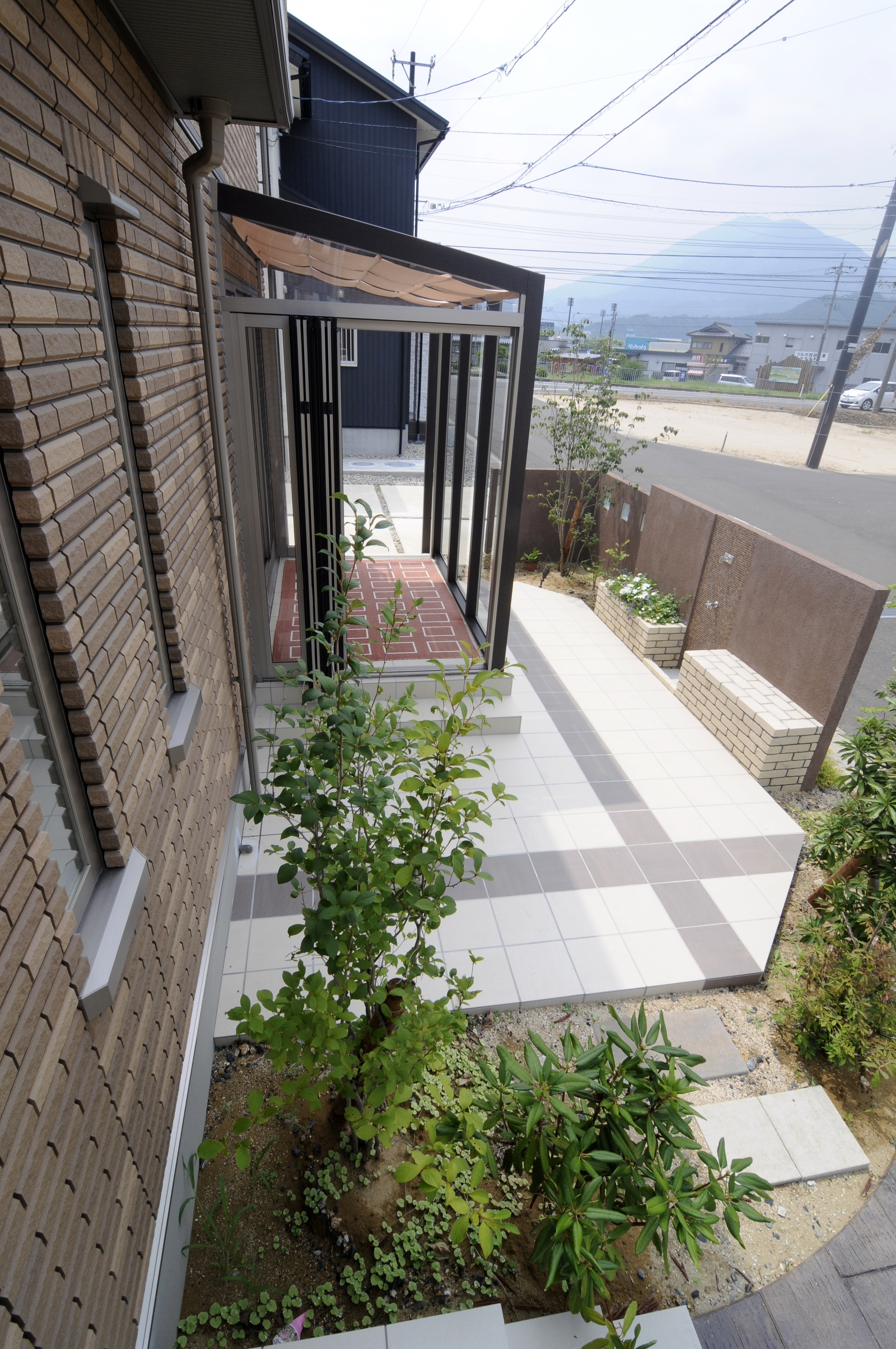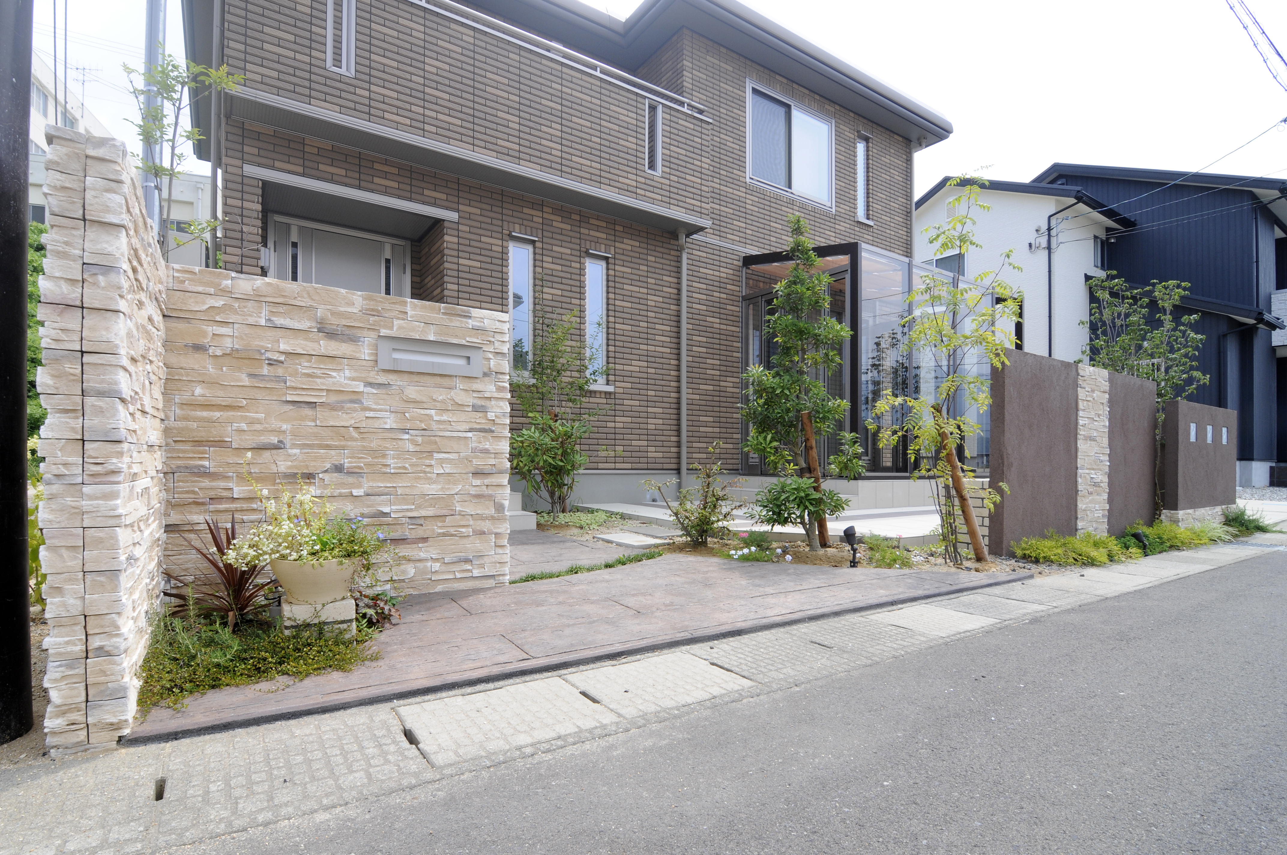 目隠しをお洒落、重厚感のあるタイルで植栽と外観との調和をはかりながら施工しました。
