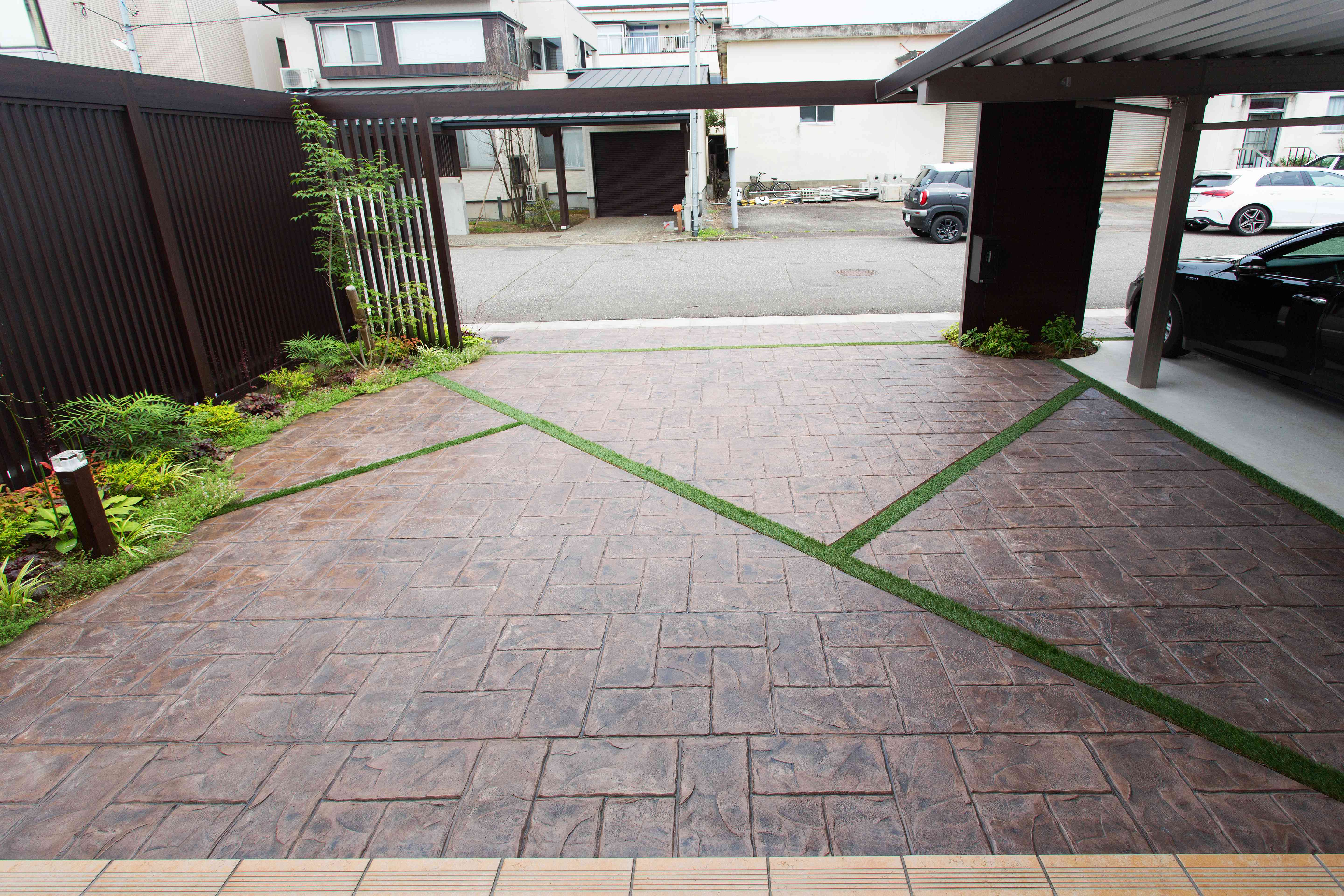 オープン外構と言っても、カーポートをフレームで隠し、道路との境界を明確化させることによって、高級感を演出しながらプライバシーを守ることができます。