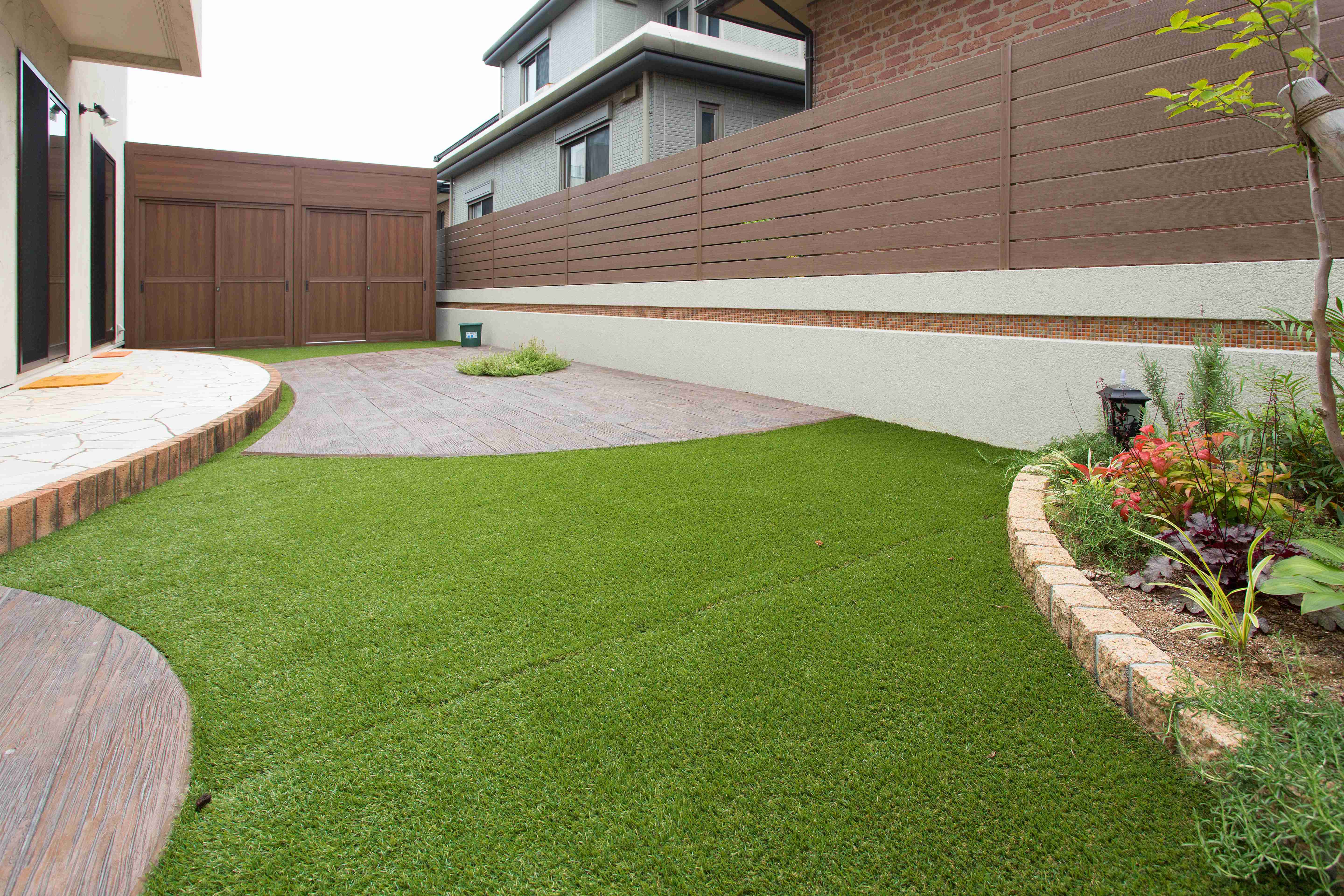 裏庭は既存のテラスのイメージから、遊びスペースに曲線のマットスタンプを組み合わせることでさらにやわらかいお庭空間に♪